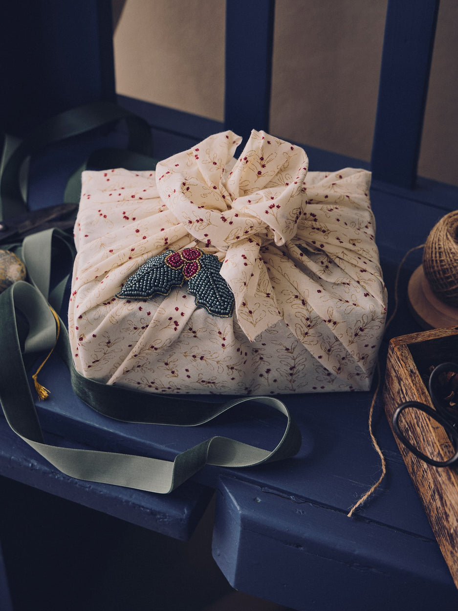 Anna gently folds the fabric, saying, "Gift-wrapping becomes an art with such delightful fabric." Clara continues, "Reusable and charming, it adds a thoughtful touch to any present, making each gift feel truly special."