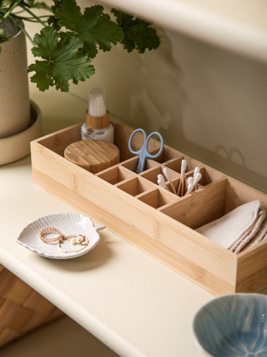 "Organising can be a delightful task," Anna says, arranging her jewellery in a wooden storage tray. Clara nods, adding, "In the bathroom, it brings order to small essentials, creating a serene space."