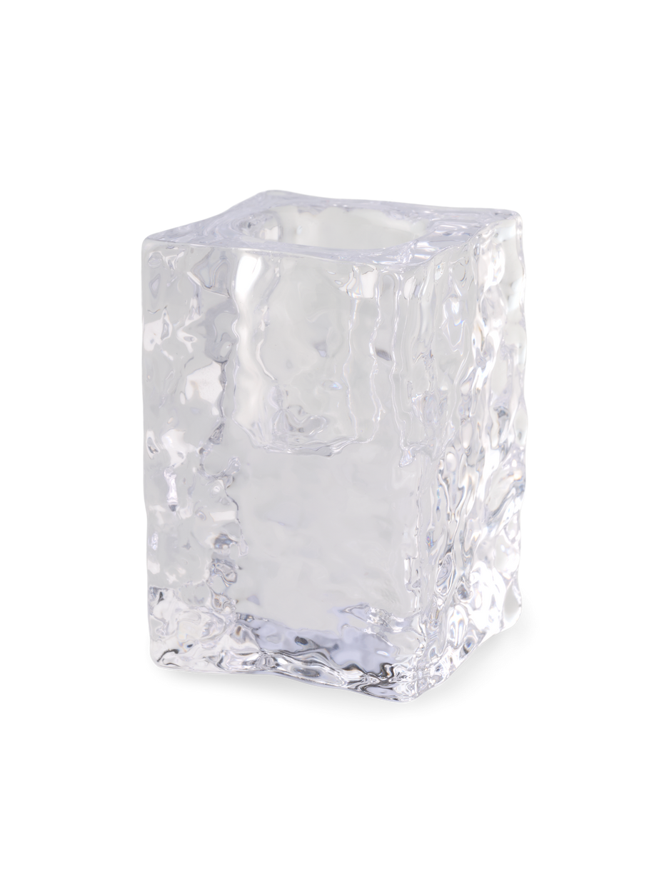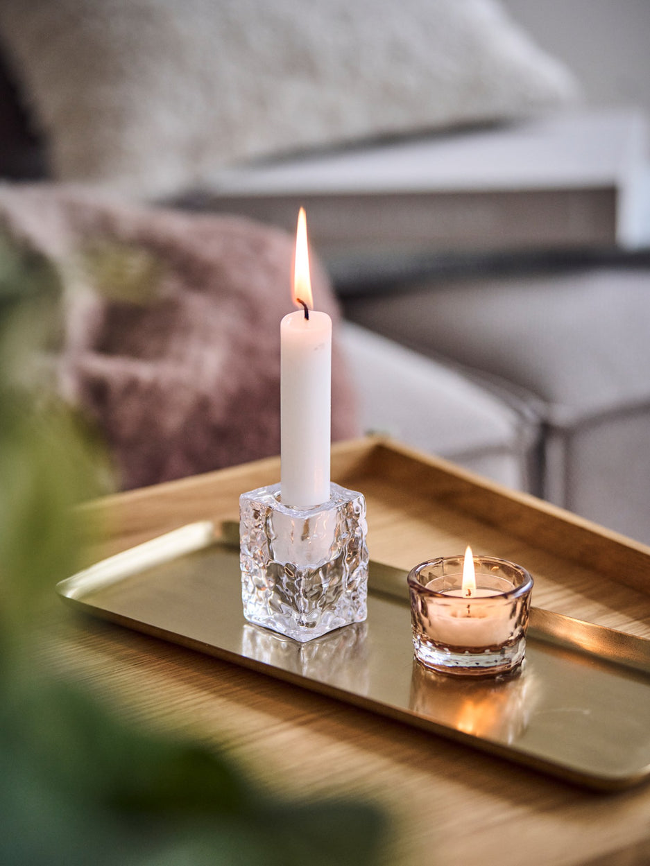 "This candleholder adds a touch of warmth to any room," Clara says thoughtfully. Anna nods, "Its textured glass design beautifully reflects the candlelight, creating a cosy atmosphere."