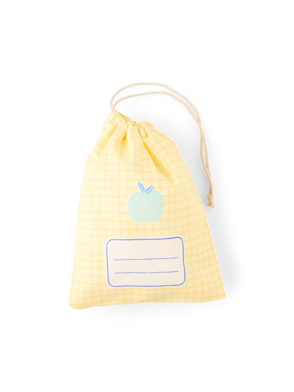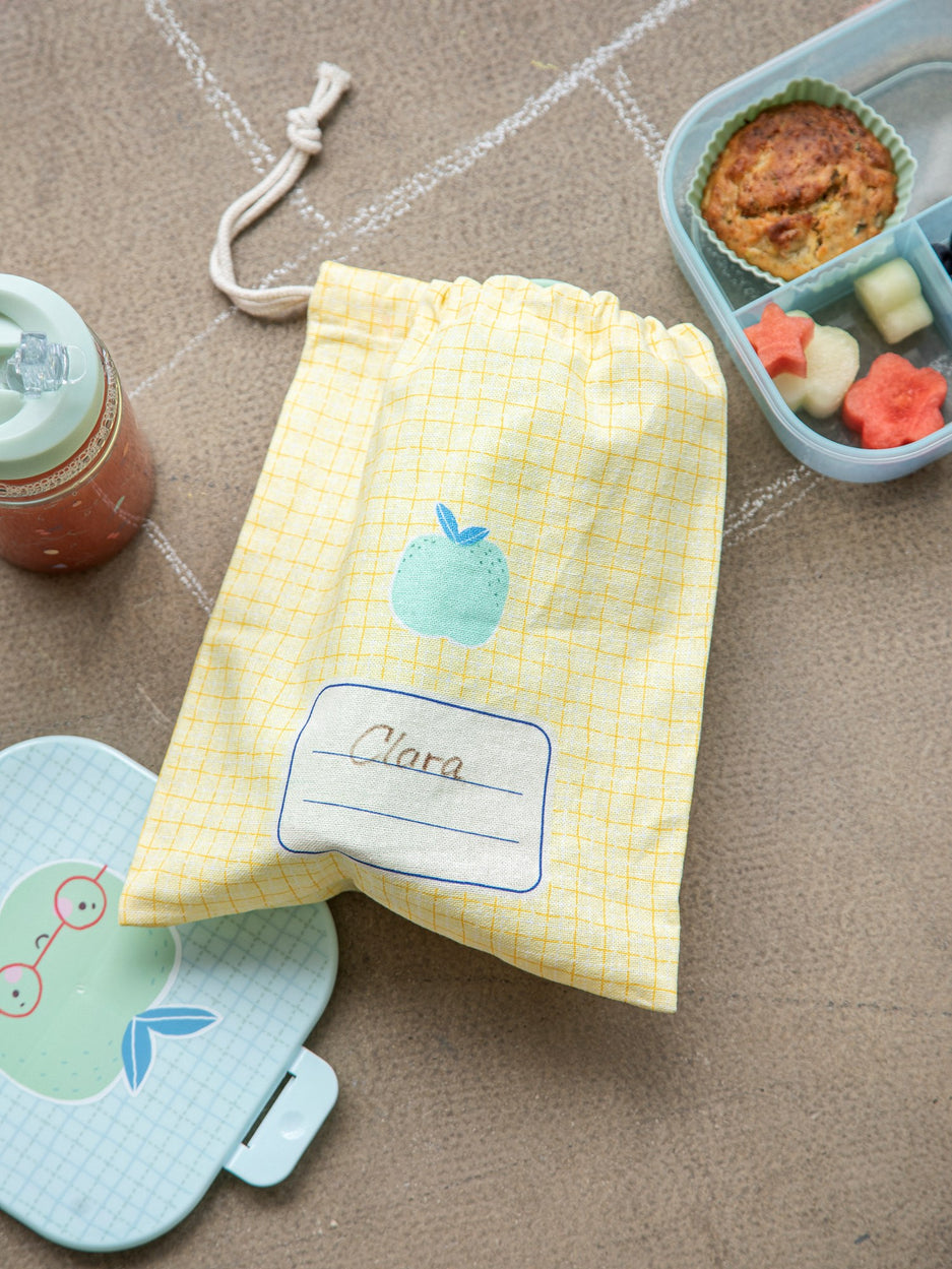 "This pouch is lovely to pack the little ones' lunch boxes in," Clara remarks, placing it on the counter. "And the printed label for names can help them not get their lunches mixed up," she adds with a smile.