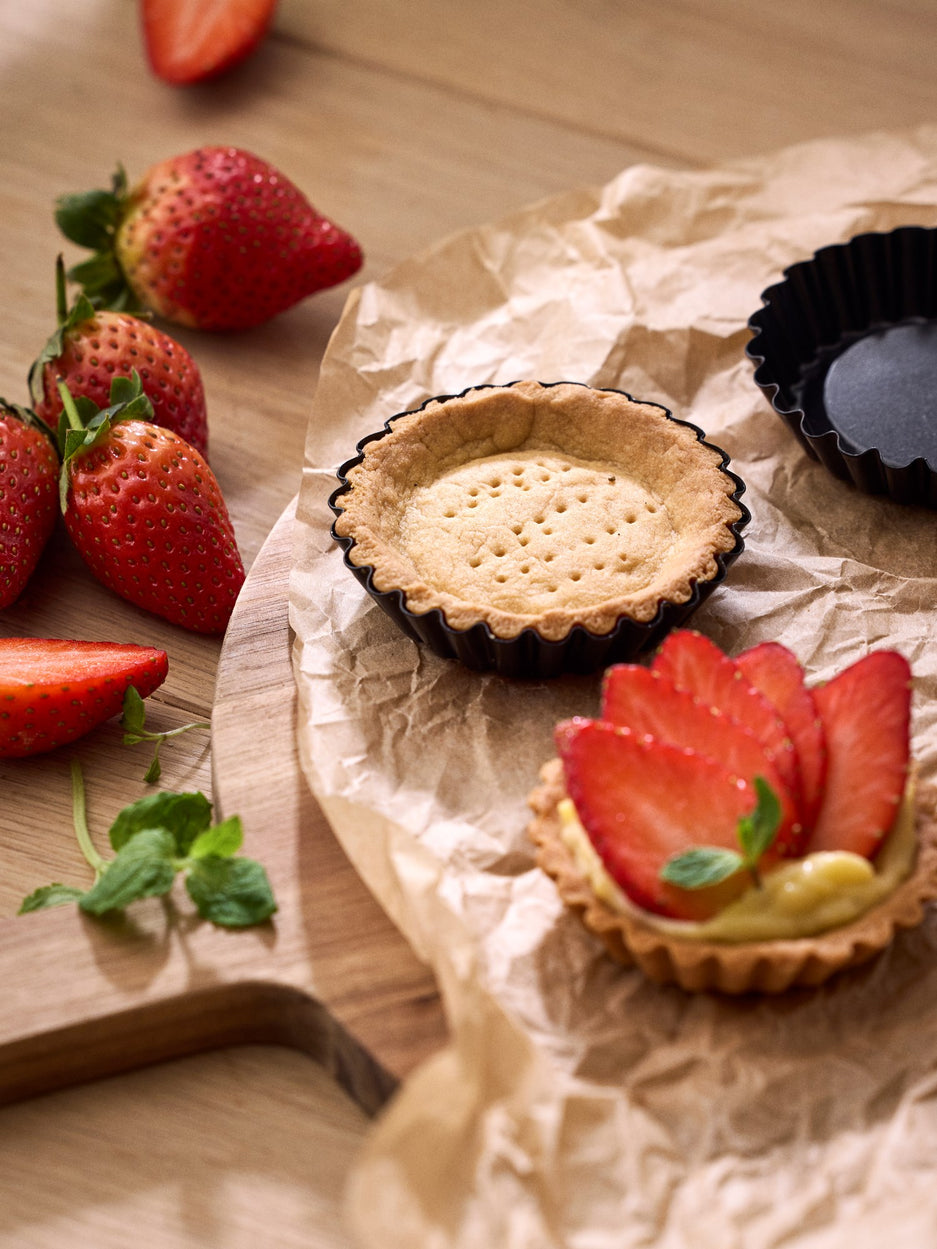 Anna happily prepares mini tarts using tart tins like this. "Such a fun way to bake treats," she exclaims. Clara smiles, adding, "They are so practical, as they can be stacked for easy storage."