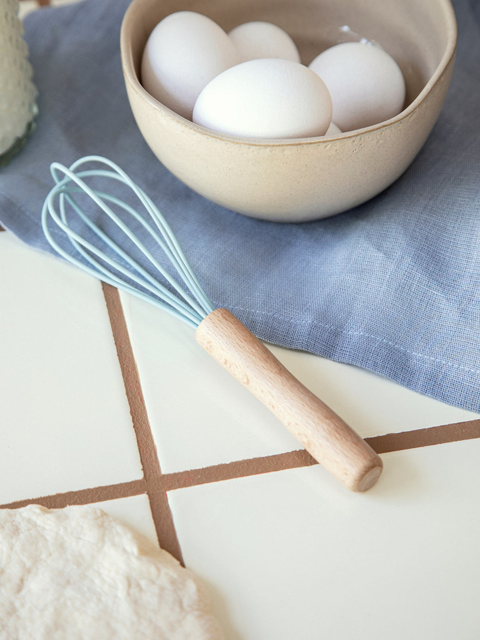 "Whisking is an art," Anna says, gently swirling the mini whisk in a bowl. "It is perfect for mixing small batches," Clara adds, appreciating its compact size. Together, they create delightful treats, sharing laughter and sweet moments.