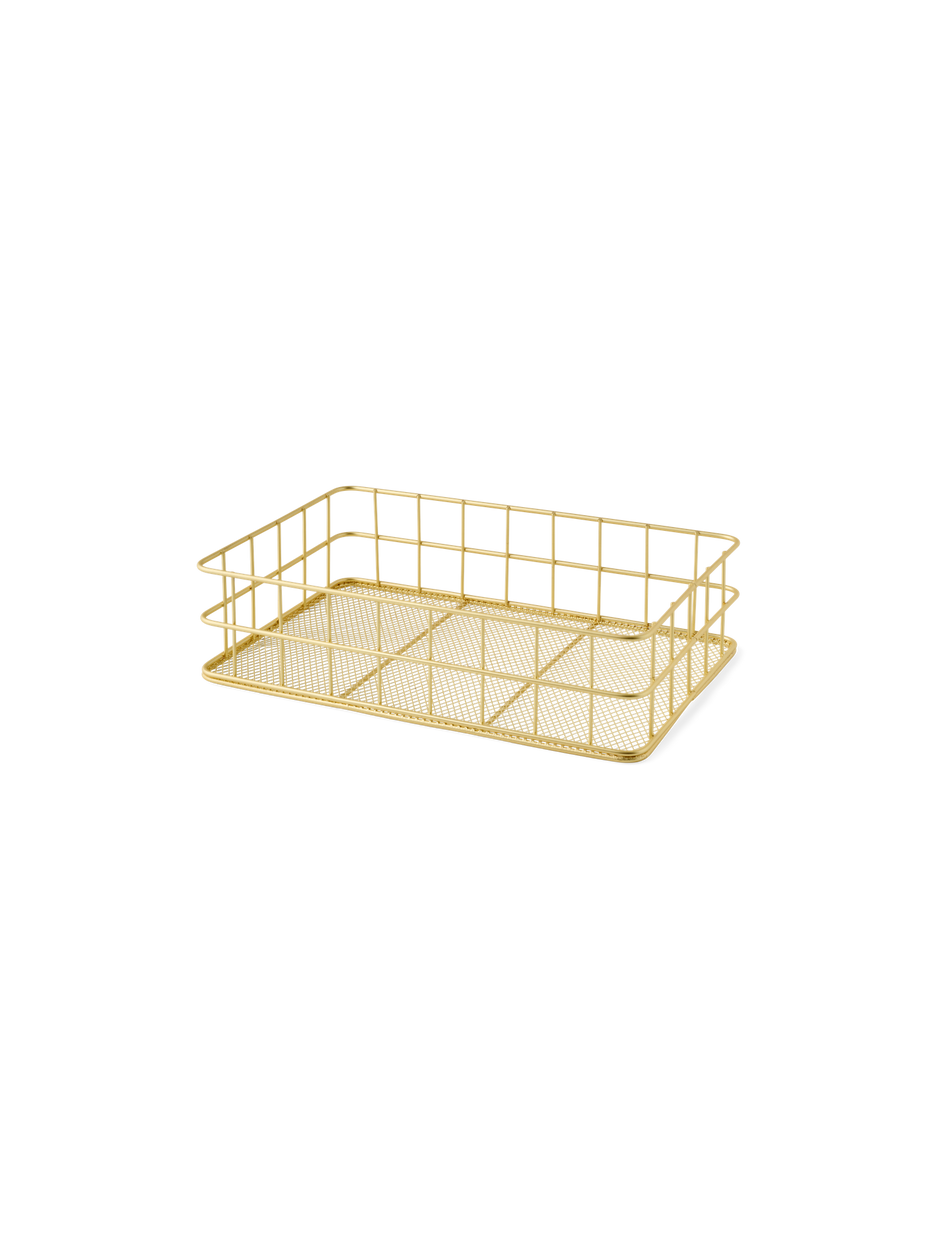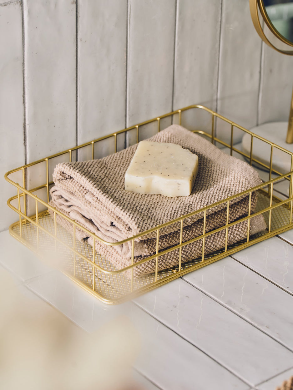 Clara says, “This wire basket brings practical calm, keeping hallway scarves and post in pleasing order.”