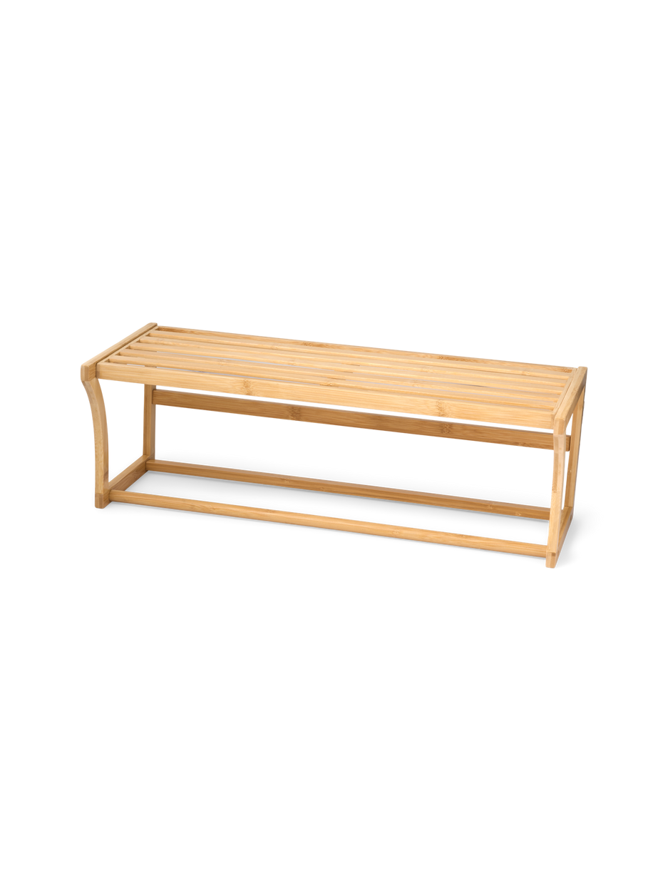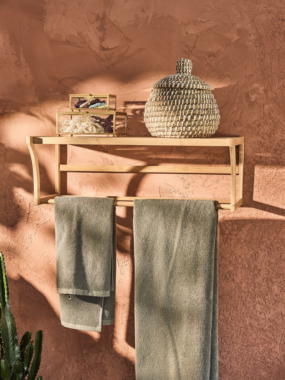 Clara arranges her toiletries neatly on the bathroom shelf. "A tidy space brings such peace to the morning routine," she says. Anna adds, "And the rack below is perfect for keeping towels within reach."