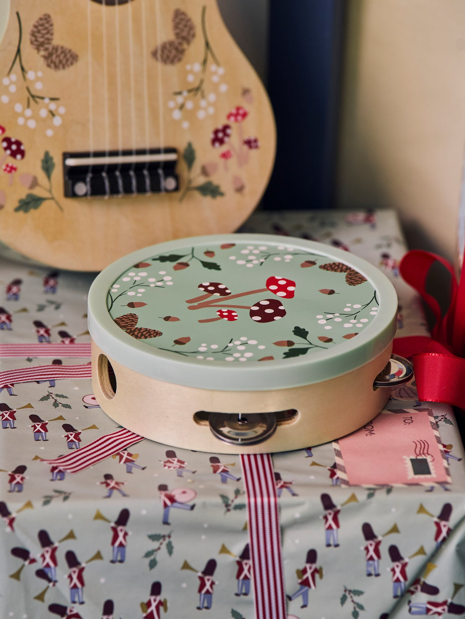 As the nephew happily composes a fun melody on the sisters' musical instruments, the nieces unwrap the fun wooden toys Clara has hidden under the tree. "Toys made of natural materials add such a touch of whimsy to the children's room," she says with a smile.
