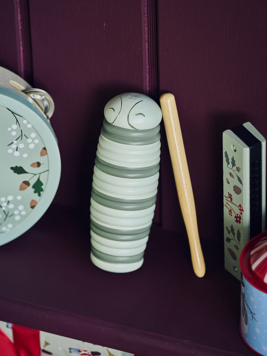 As the nephew happily composes a fun melody on the sisters' musical instruments, the nieces unwrap the fun wooden toys Clara has hidden under the tree. "Toys made of natural materials add such a touch of whimsy to the children's room," she says with a smile.