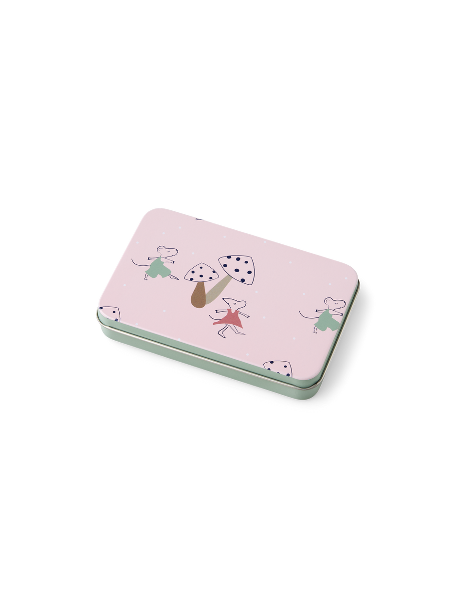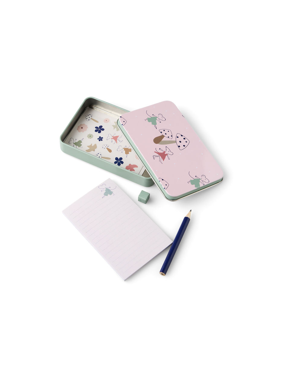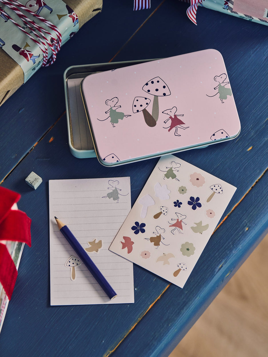 Clara gently places the tin box on the table, saying, "This set is both practical and charming for jotting down thoughts." Anna adds with enthusiasm, "A delightful way to keep creativity close at hand wherever you go."