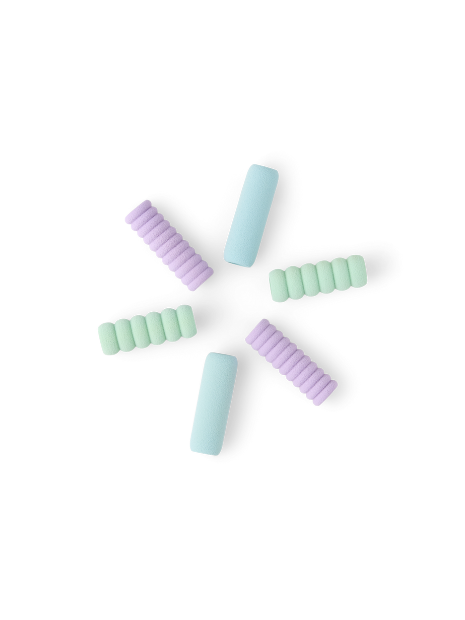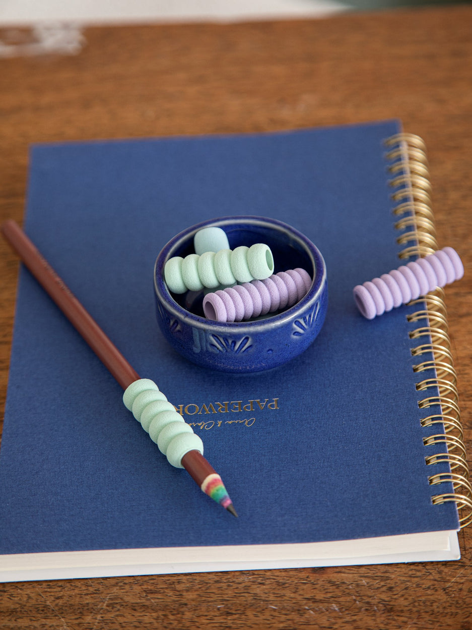 Anna and Clara delight in the small joys of writing. "These pencil grips make writing more comfortable and enjoyable," Clara remarks. Anna exclaims, "A lovely way to add a touch of colour to your desk accessories!"