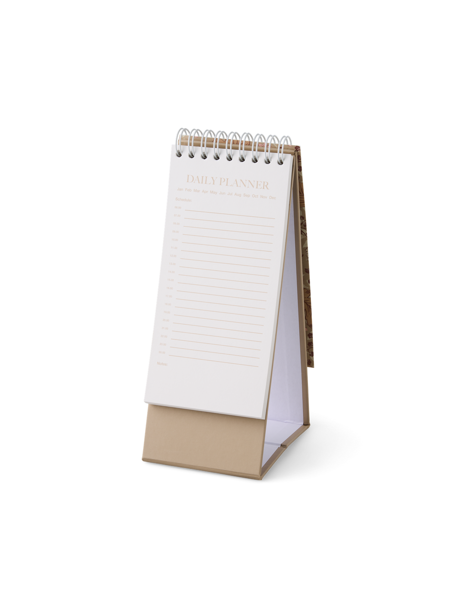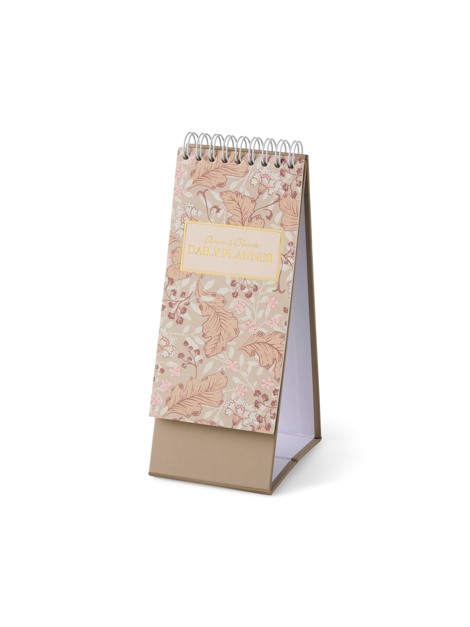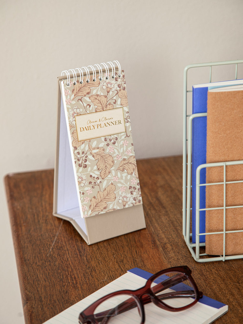"Organising one's thoughts on paper brings such clarity," Clara says as she places the desk planner on her table. Anna adds, "It is a delightful way to keep track of creative ideas and daily tasks."