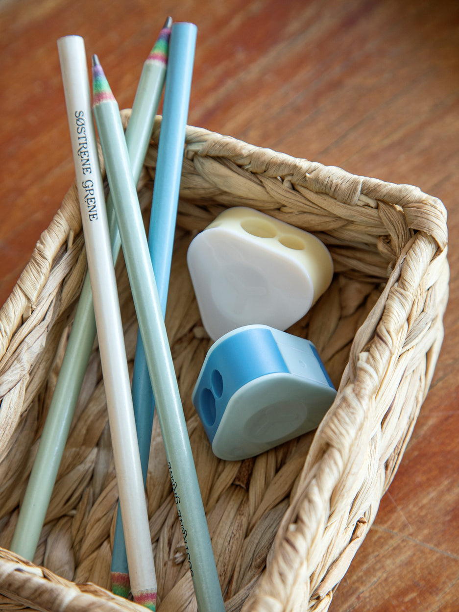 Anna and Clara delight in the simple joys of writing and drawing. "A triangle sharpener keeps pencils ready for creativity," Anna remarks. Clara adds, "Its unique shape makes it both practical and charming."
