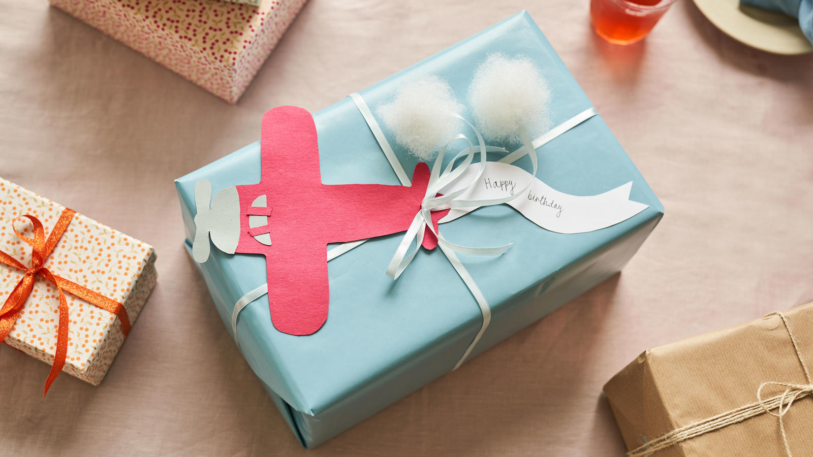 Cut another piece of ribbon of approx. the length of the present. Bring this under the joint of the original ribbon on the present. Place the airplane on top, so the hole is above the joint.