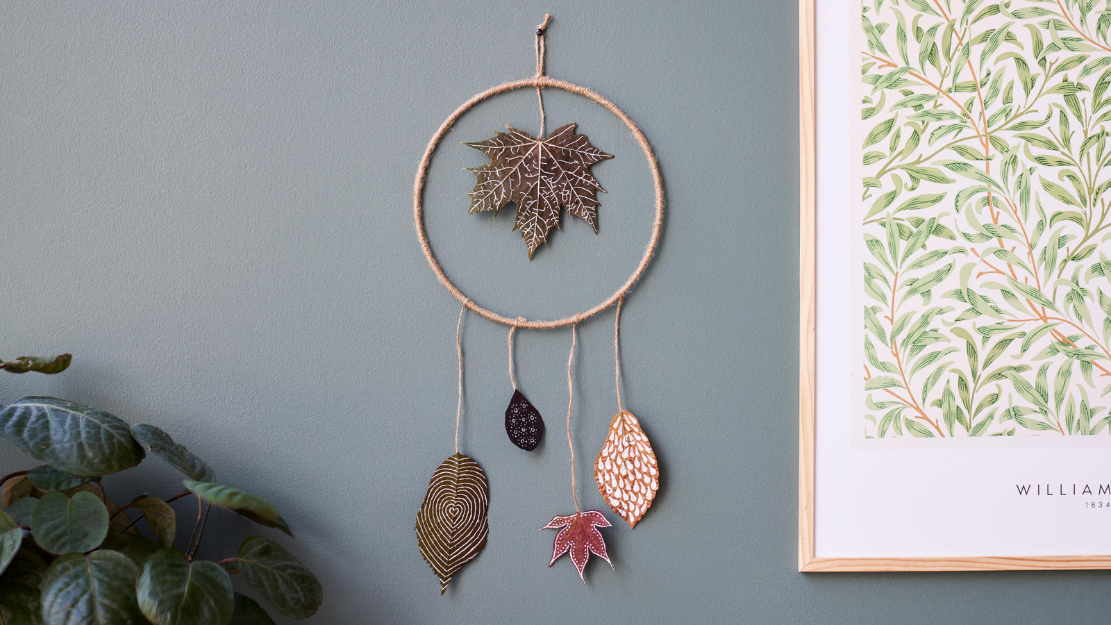 Cut the stem off each leaf and glue a piece of 10 cm jute twine on the back of each leaf so the twine is attached vertically at the top.
