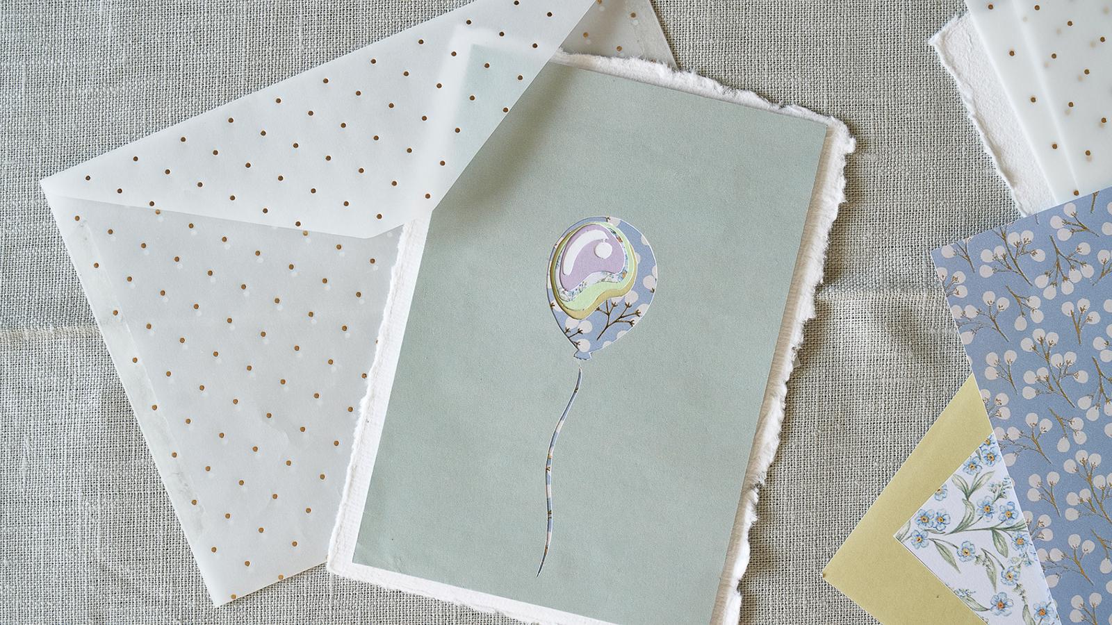 "What could be more festive than a balloon," Anna asks. When she cannot think of an answer for that question, the motif for the invitation is settled. The patterned layers of paper make for a colourful and personal invitation, Anna thinks.