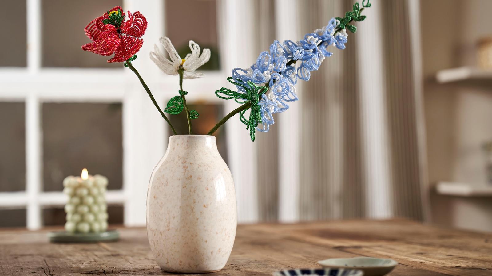 "One by one, the little beads fall into place before finally blooming into a lovely lupin," Anna smiles and adds another blue bead to the thread. Follow in her footsteps by using the guide to create your own beaded flowers in your preferred colours.