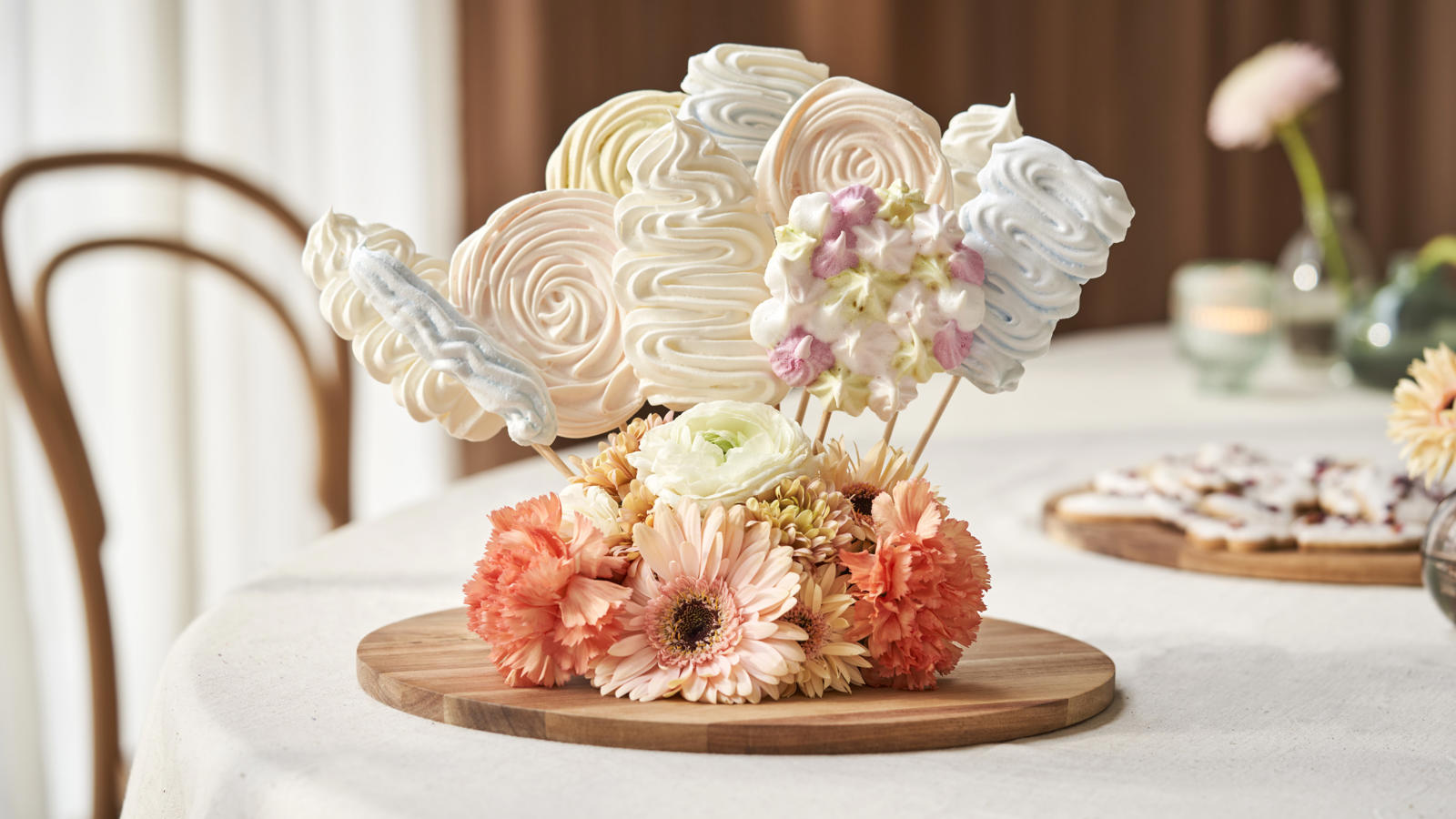Your meringues are now ready to be enjoyed, and you can, for example, let them be a part of a beautifully decorated table by sticking them into a piece of floral foam along with wonderful flowers.