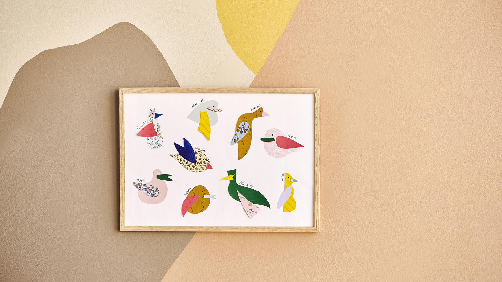 When you are happy with the look of the collage, you can secure the birds with double-sided adhesive tape before you place your artwork in a frame and hang it on the wall.