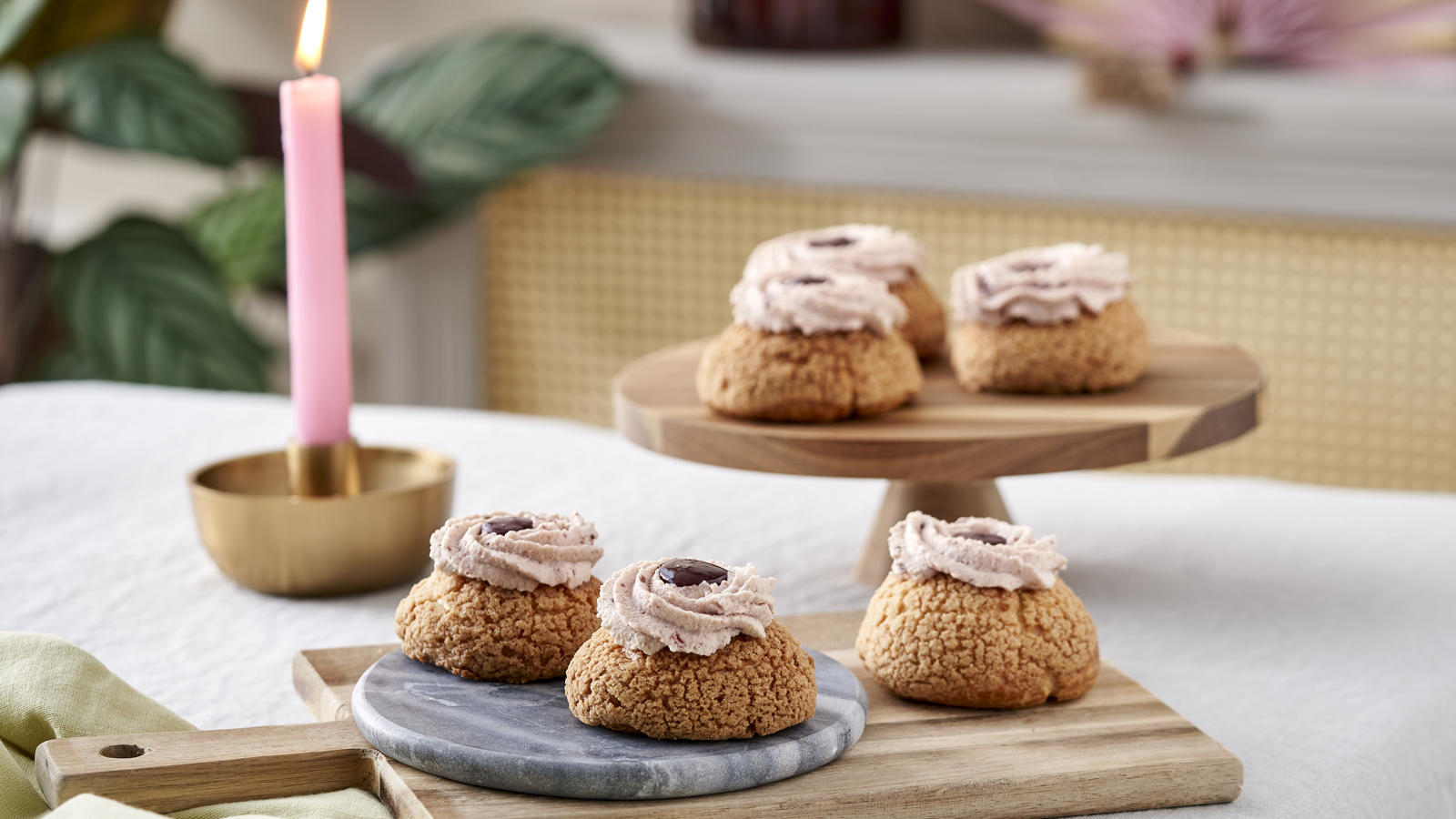 Pipe out little cream puff tops with a diameter of approx. 5 cm on a baking tray lined with baking paper. There is enough dough for five or six puffs. Place a cookie top on each puff.