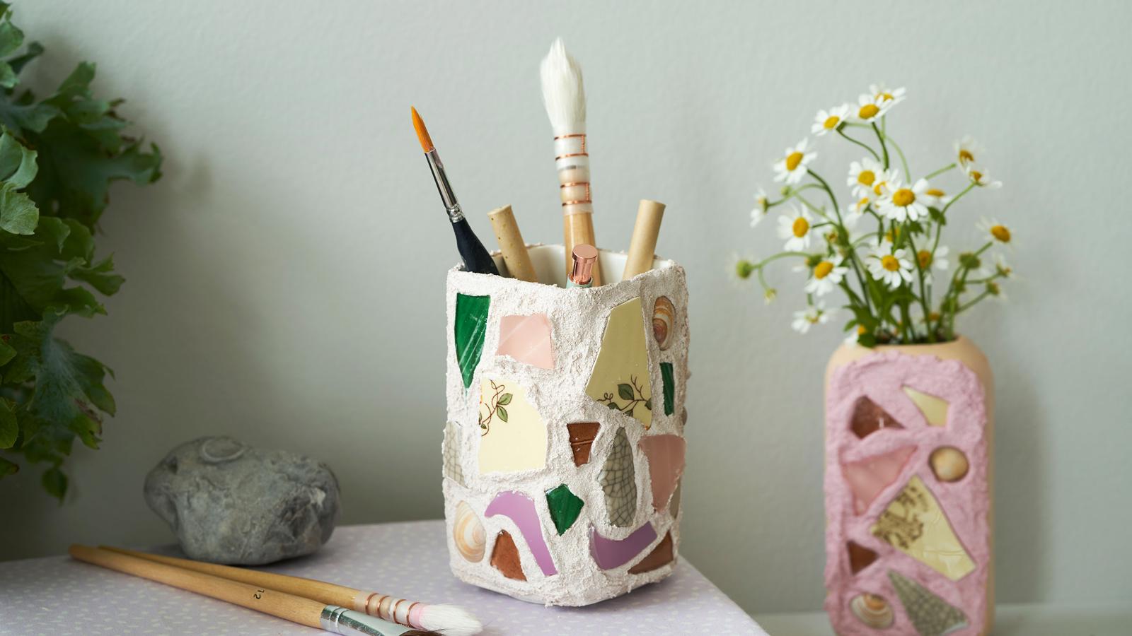 It is a good idea to make a plan for how you want to place the broken pieces of ceramics and glass. Draw the shape of the vase or jar on a piece of paper. Place the broken pieces in a pattern you find harmonious. From here, it is quite easy to place the pieces directly on the item you are decorating.