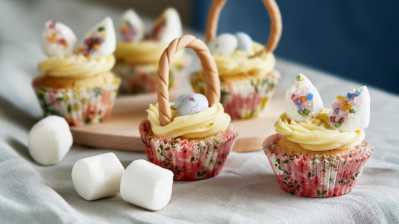 After the Easter lunch, the guests need a little something sweet. Anna and Clara serve tasty cupcakes with white chocolate ganache, decorated like Easter baskets and bunnies.