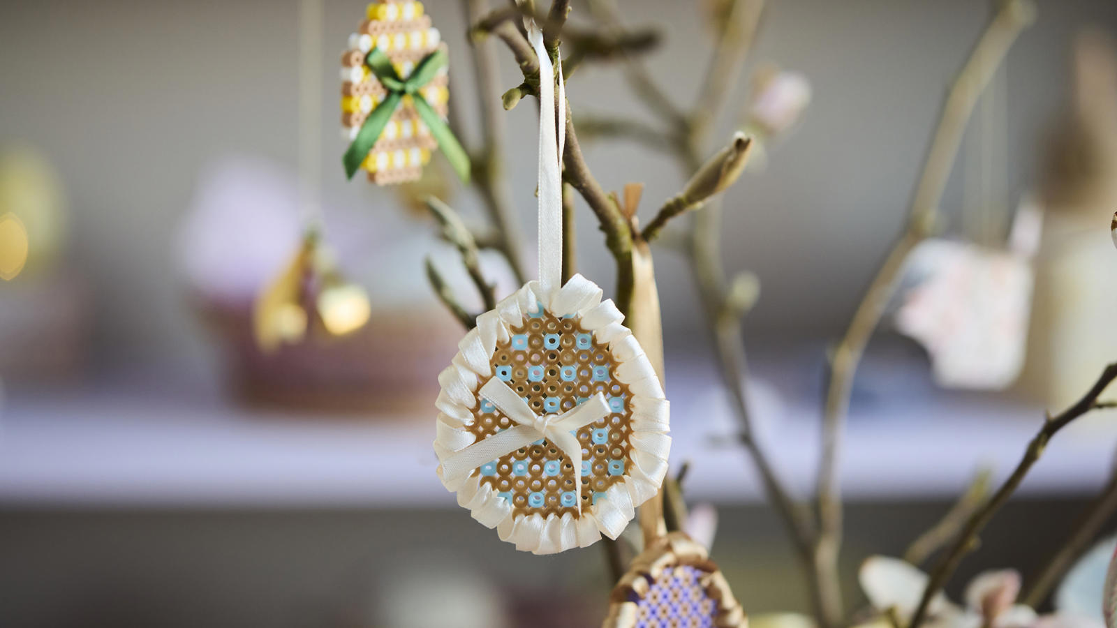 In an easy and simple way, Anna has transformed beads and ribbons into the loveliest Easter eggs, ready to be hung up. Try it yourself, and let the little ones join in.
