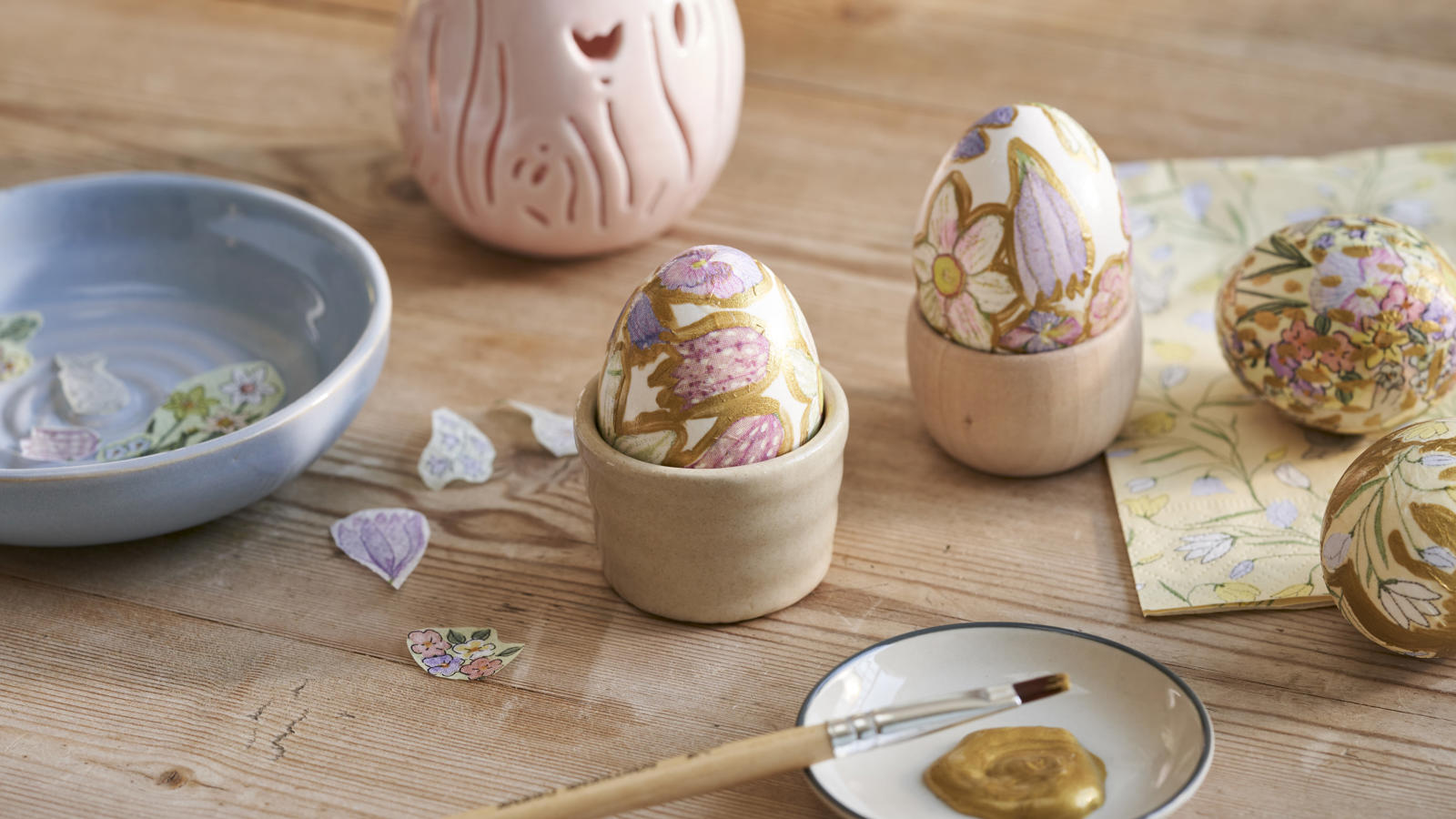 Begin by boiling the desired number of eggs. Once the egg is cold, you can decorate it any way you like. Here, Anna and Clara have chosen decoupage with floral napkins and a touch of gold.