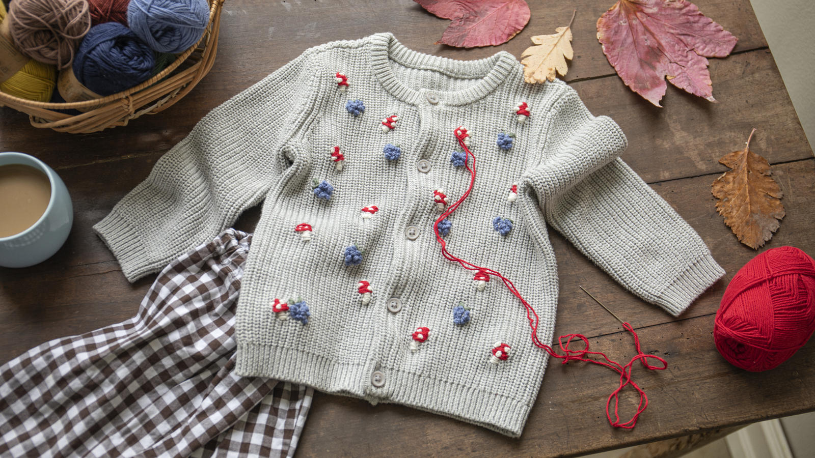 Anna has gathered leftover yarn to decorate her nieces' and nephew's old knitted jumpers. "With small, charming additions, the jumper receives completely new life," Anna explains. You, too, can easily upgrade your knitwear with personal embroidery.