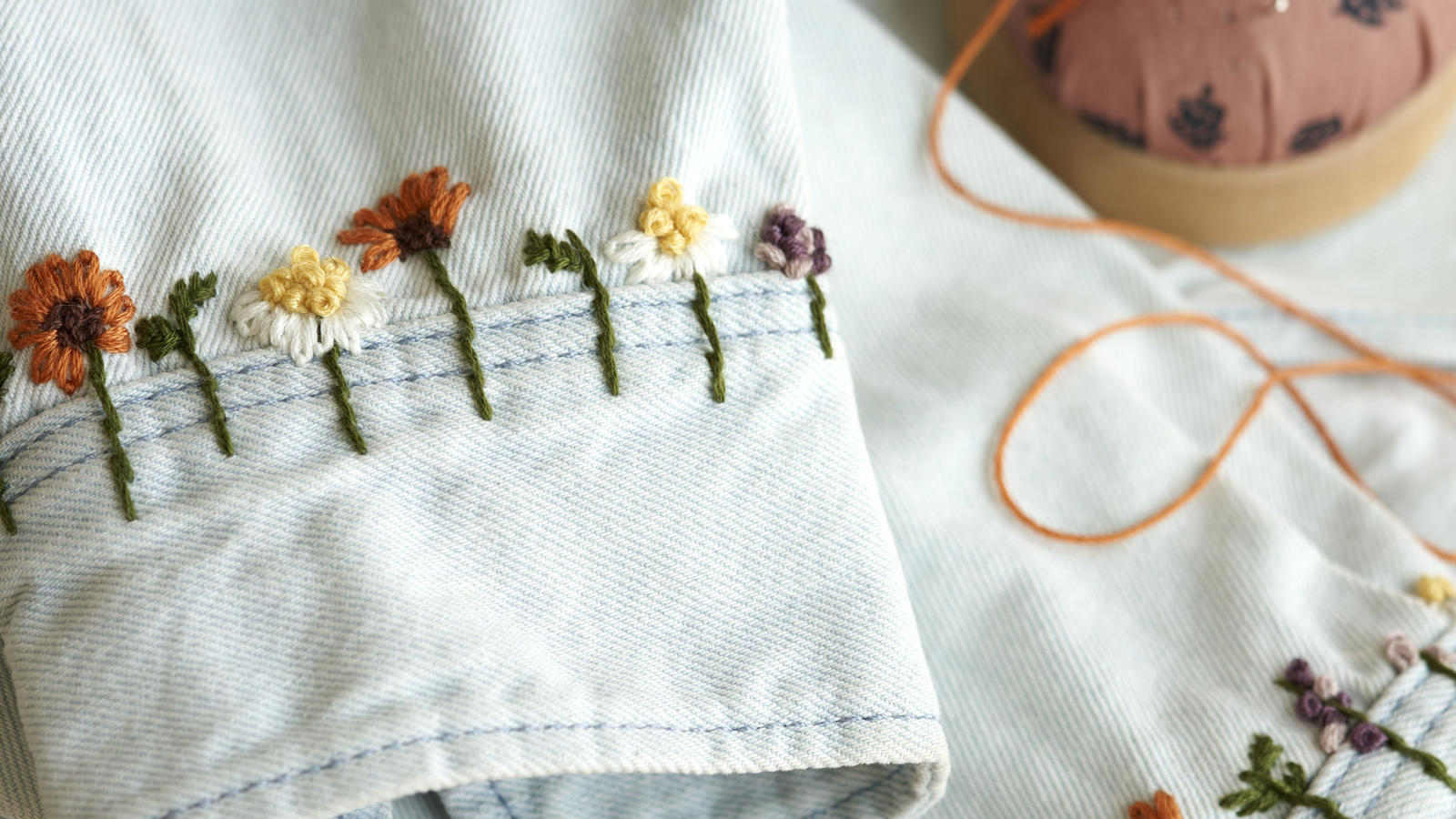 "Old, worn, or recycled clothes can easily be given new life with embroidery," Anna smiles as she embroiders the loveliest flowers onto her jacket with colourful embroidery thread. "And furthermore, the creative moment is incredibly cosy in itself," she continues.