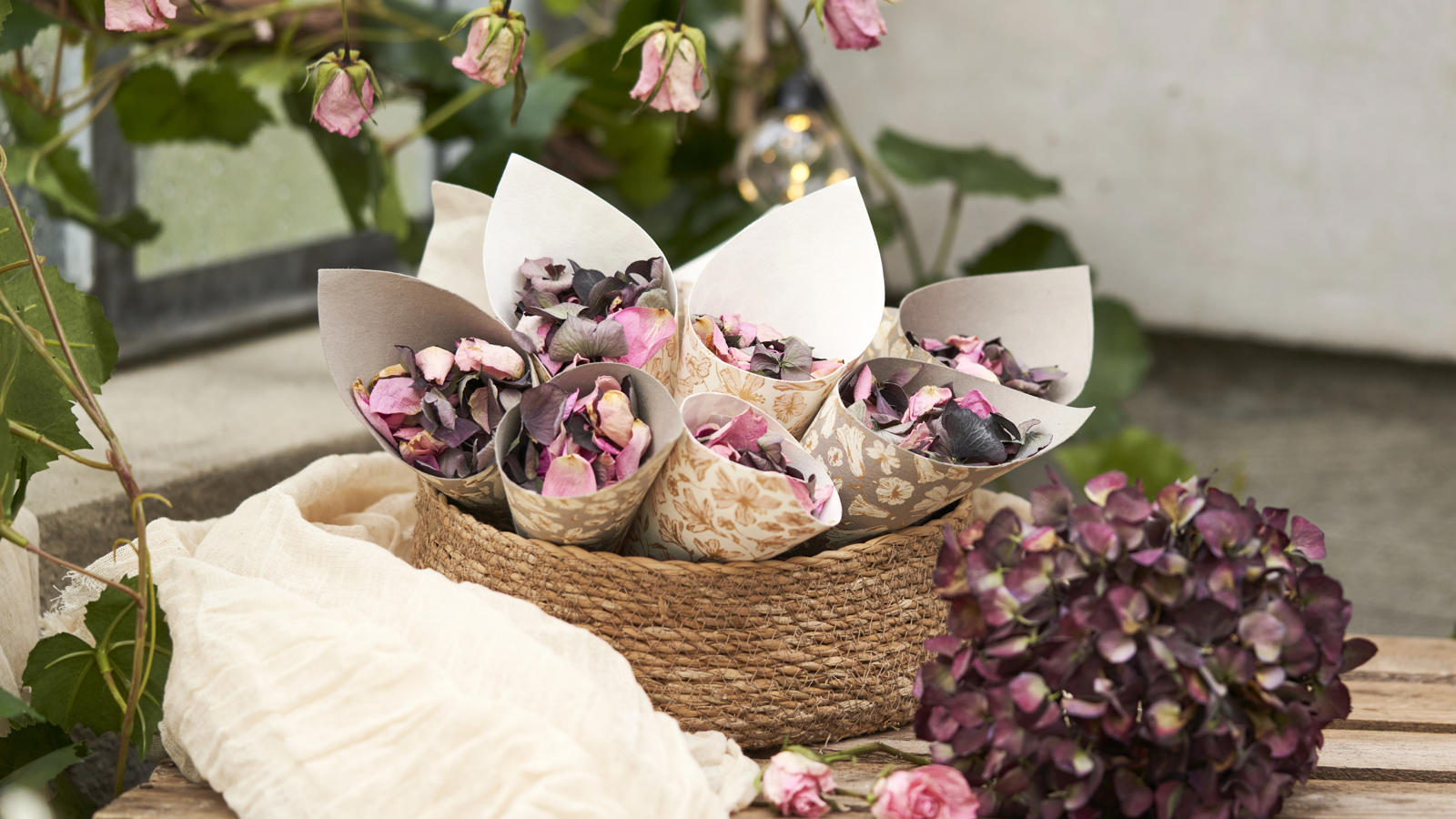 Make simple cones filled with flower confetti for festive events. "Flower confetti is ideal for grand events like weddings," Clara smiles. Make confetti out of dried roses or other beautiful flowers.