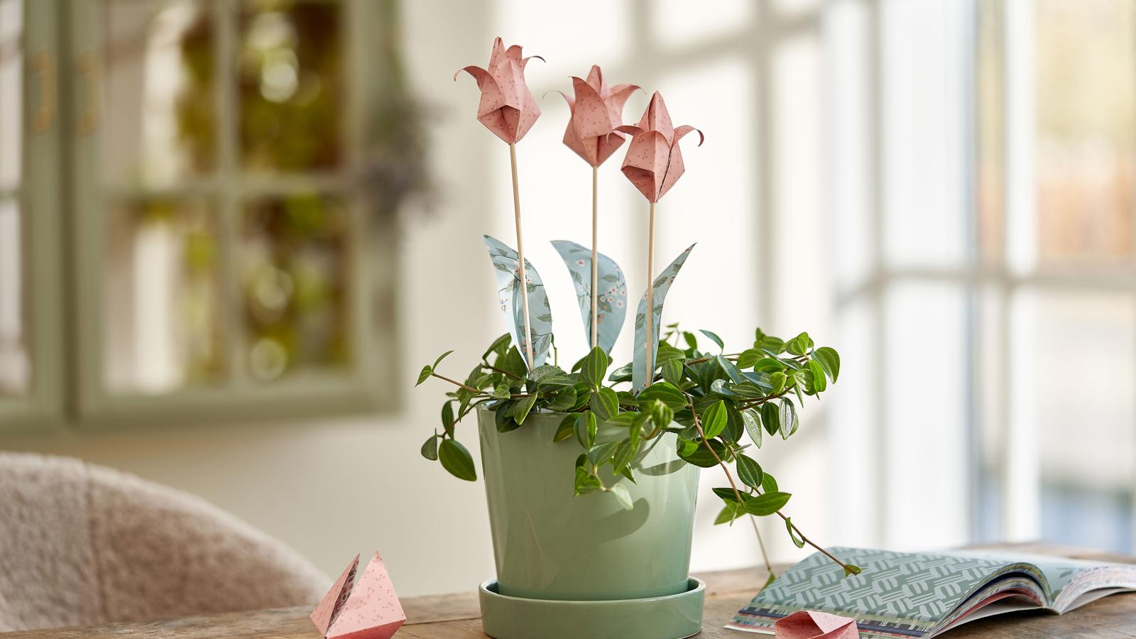 On one of the sisters' trips to The Netherlands, Anna was inspired to create this origami tulip. "Let the tulips on sticks decorate a flower pot, make a whole bouquet of them, or use the flower heads on their own in a mobile or as an hanging ornament," Anna suggests.