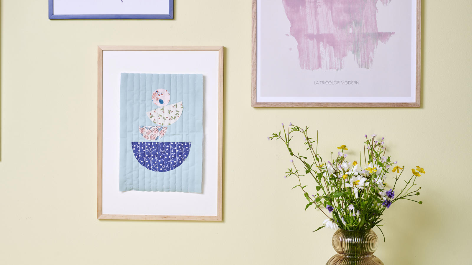 A lovely pathwork piece can be an interesting addition to the gallery wall. "The eye is drawn to what stands out," Anna says while she carefully cuts out the different shapes of patchwork fabric.