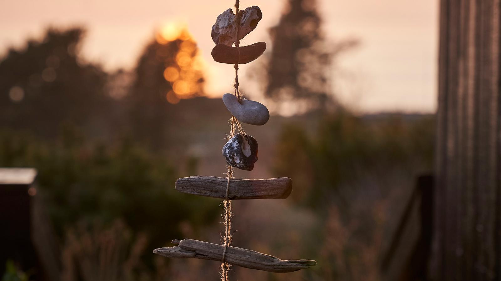 Tie a hag stone or a piece of driftwood on the twine under the noose and continue downwards in the same way until you have tied all stones and all pieces of driftwood on to the mobile. Finish with a knot and cut off any excess twine.