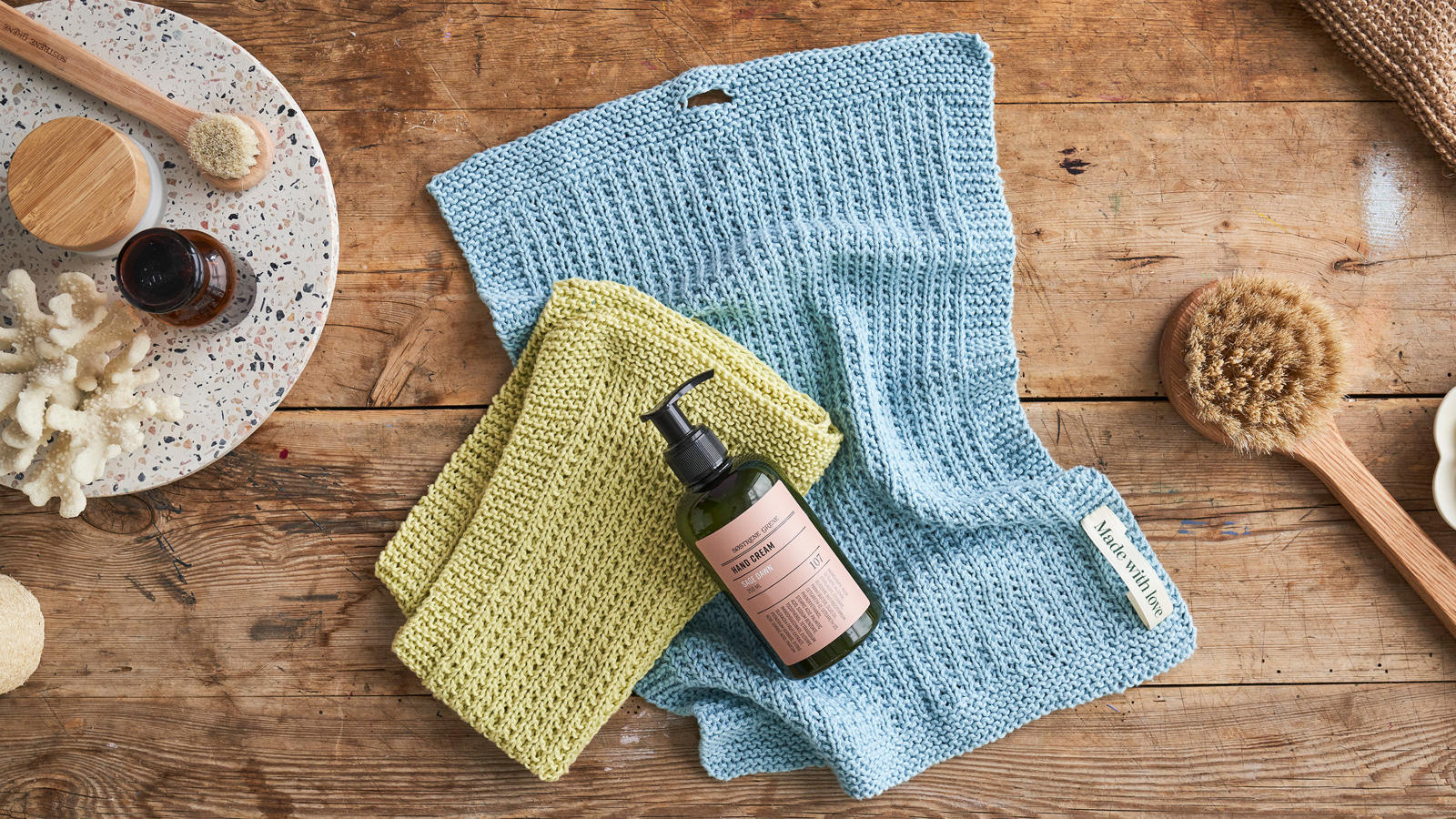 The hand towel is knitted in mock rib pattern back and forth on the needle. To make one hand towel, you will need 50 g of yarn. You can make the hand towel plaincoloured or with stripes using yarn leftovers.