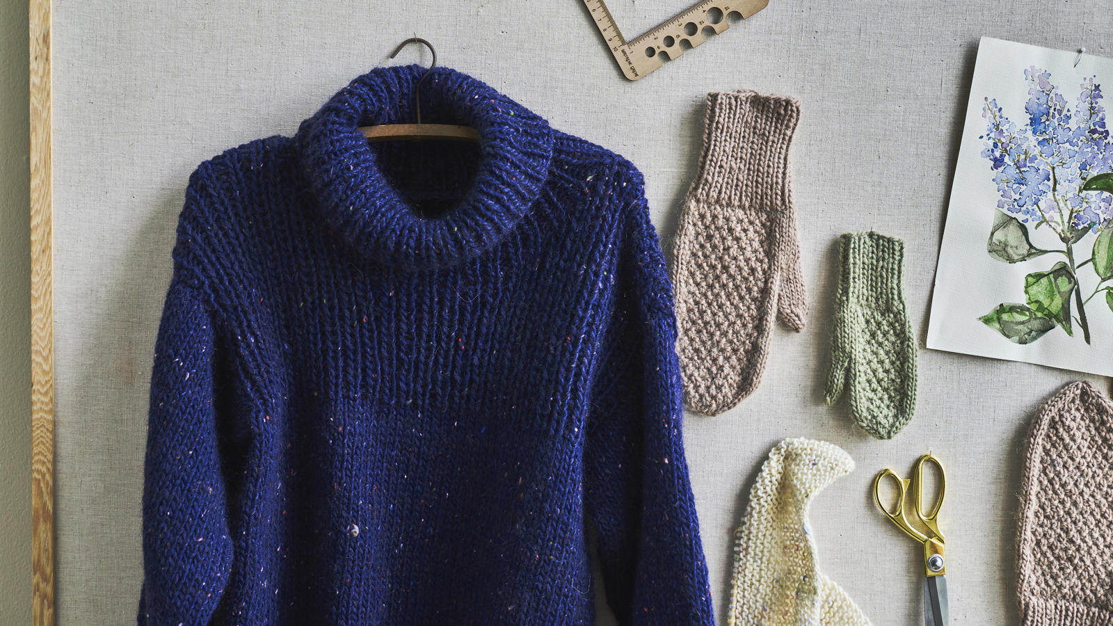 The sweater has separate back and front rib borders and a stocking stitch body knitted in the round. The work is then divided at the armholes and the yoke knitted in rib stitch. The sleeves are knitted in stocking stitch either back and forth on circular knitting needles or in the round on double-pointed knitting needles. The collar is knitted in rib in the round on a circular knitting needle or double-pointed knitting needles. You can also use this pattern to knit a turtleneck vest. Just omit the sleeves.