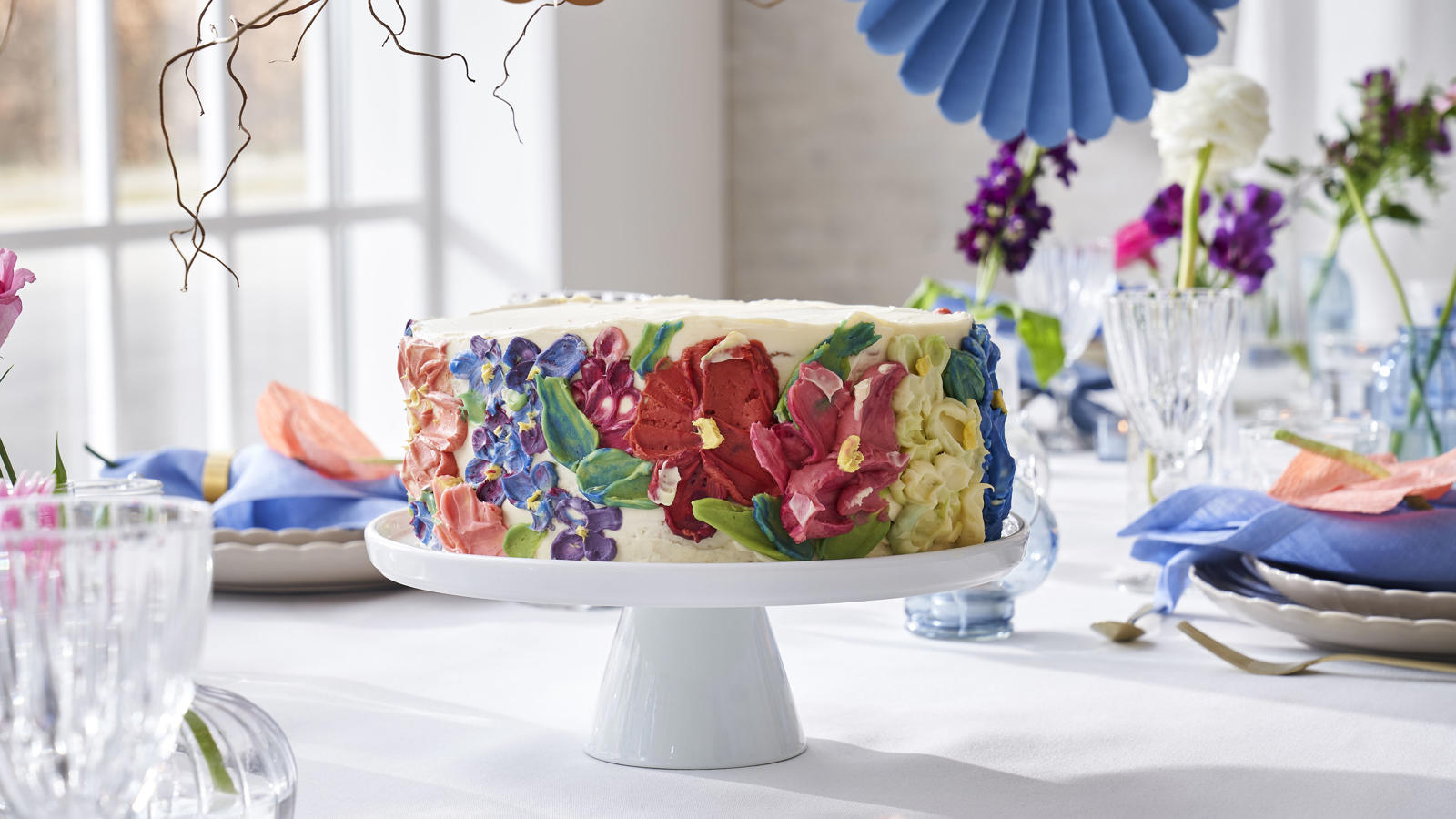Place the cake on the cake stand you wish to serve it on. Decorate the cake with flowers and leaves of coloured frosting. Place a bit of the colours at the time on a small cutting board. The edges of the cutting board make it easier to control the frosting. Use a little spatula to “paint” flowers on the cake. In between decorating, you can put frosting and cake back in the fridge for a little while to the texture does not become too soft.