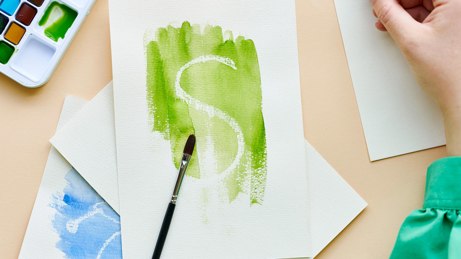 Preparation: Write the letter on a sheet of paper using a white crayon. Draw some other motifs on a number of other sheets of paper also in white crayon, so they are invisible. Description: On one of these blank sheets, the next letter is hidden. Make it appear with water colours. Choose the sheet of paper you wish to examine and paint on.