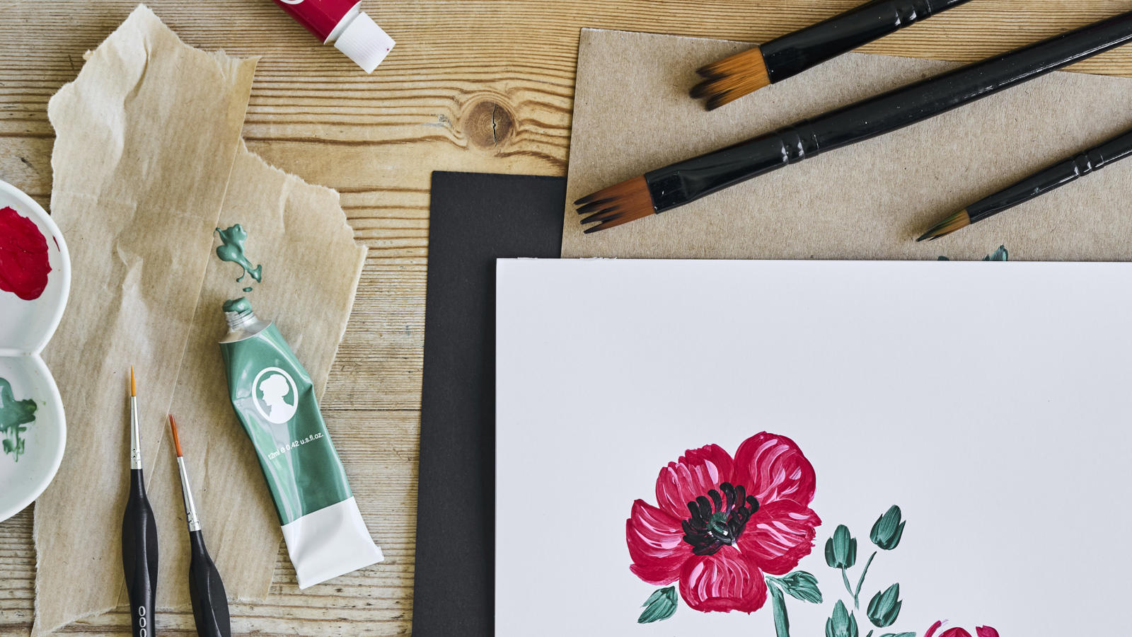 When you have finished painting the red flowers, the brush should be cleaned in warm water and dried, so it is ready for a new colour later.