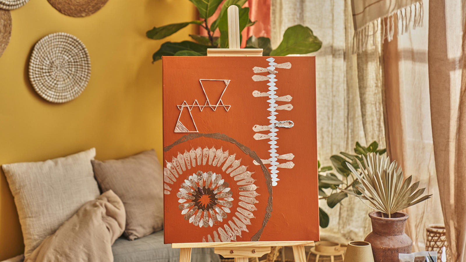 Once the paint is dry, the painting can be completed with yarn and a thick needle. Sew delicate patterns onto the painting, as shown in the video, or let your imagination run wild. Fasten on the back of the canvas.