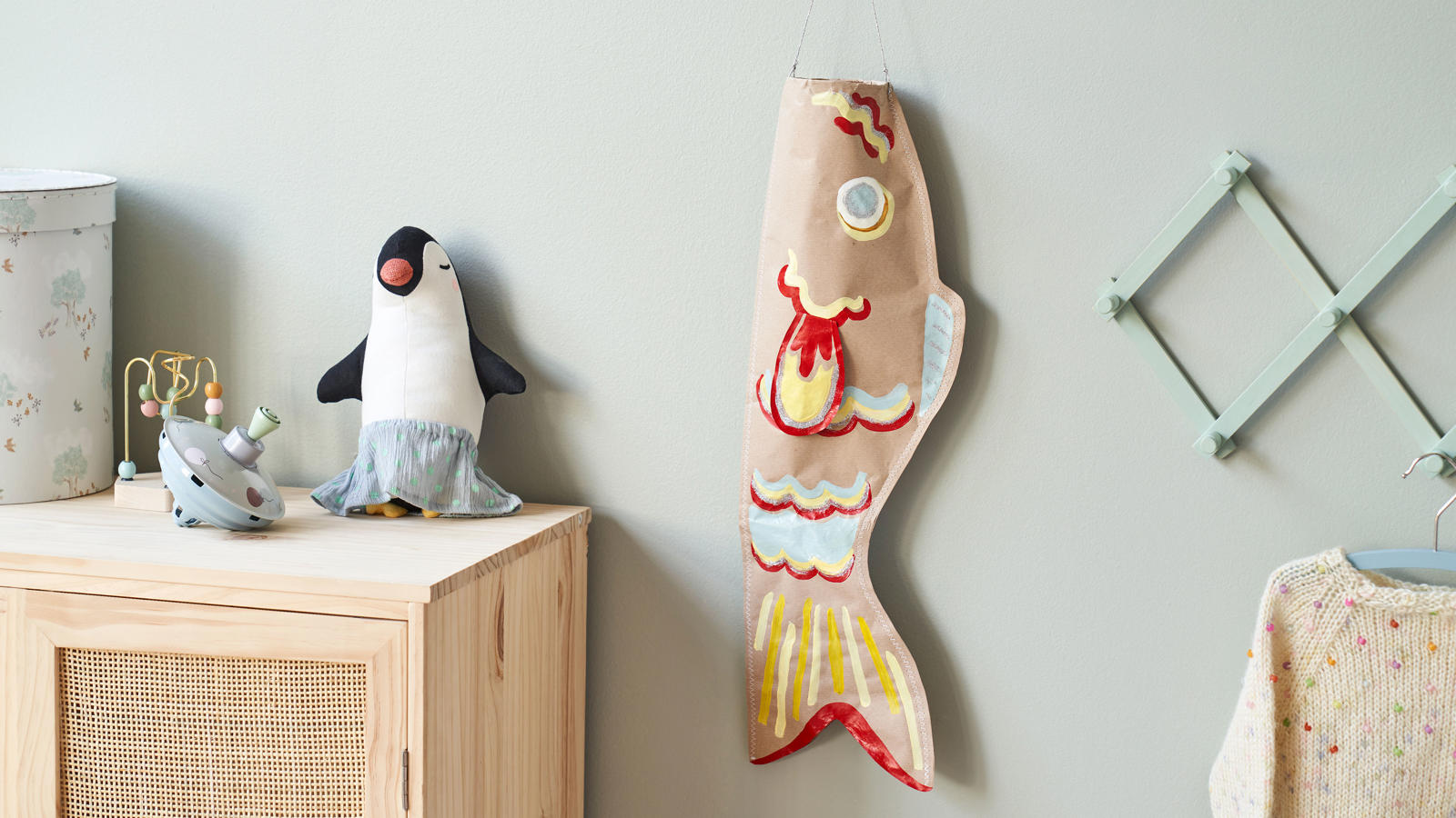 The sisters have visited Japan, and Anna has become quite inspired after seeing many motifs with koi fish. As she is hanging this fish in the dear little ones' room, Clara entertains the nieces and nephew with stories from the trip.