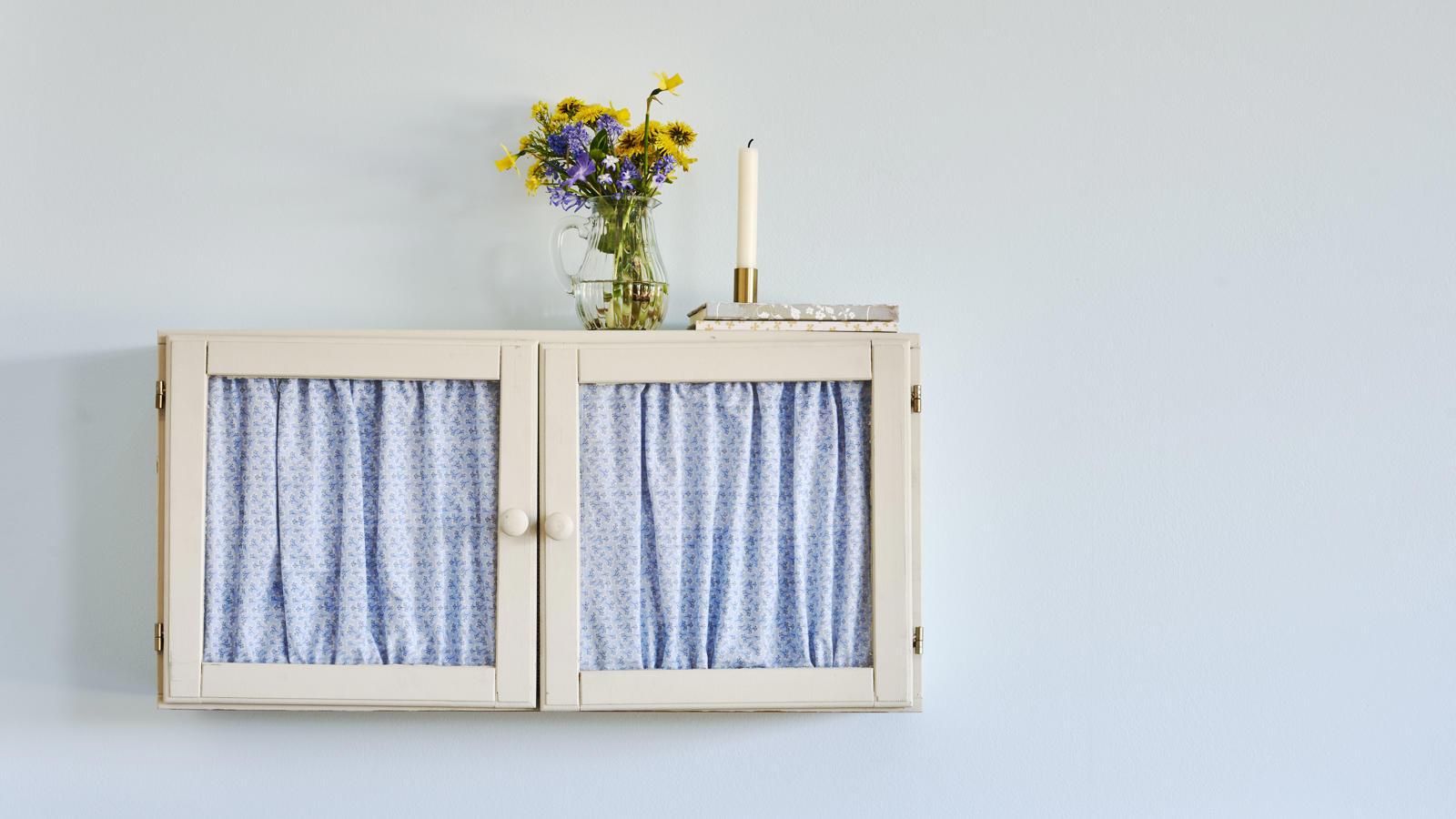 You can also cover the inside of the cabinet with gift-wrapping paper, so a lovely colour could peek out, if you chose to pull the curtain a bit to the side. Here, it would be a good idea to use spraying glue or double-sided adhesive tape and make sure to measure the cabinet and cut out separate squares of paper for each part of the cabinet’s inside before placing the paper. If you use spraying glue, remember to cover the parts which should not be glued.