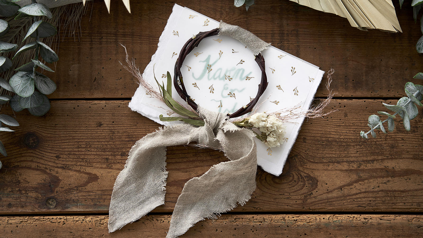 Wrap the strip loosely around one side of the willow branch circle on the invitation. Then, tie the strip loosely around the invitation. Tie a knot and let the ends hang loose.