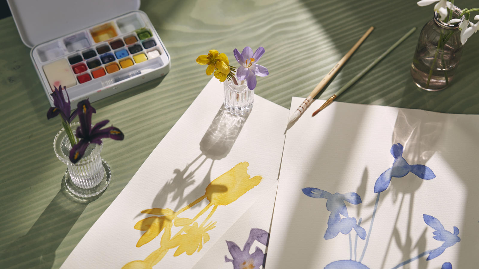Shadow painting is a simple technique with a marvellous outcome, according to the sisters. "An ideal activity for both young and old in spring sunshine," remarks Anna, who patiently shows her nieces how the shadows of the flowers dance on the paper and are captured with delightful watercolours.