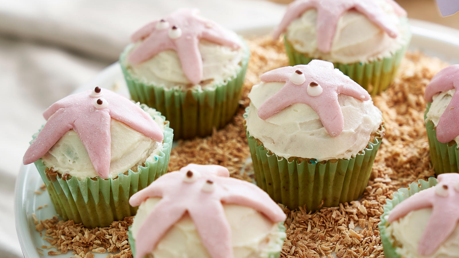 Shape stars out of the marzipan and attach the eyes. Decorate your muffins with a starfish on each muffin.