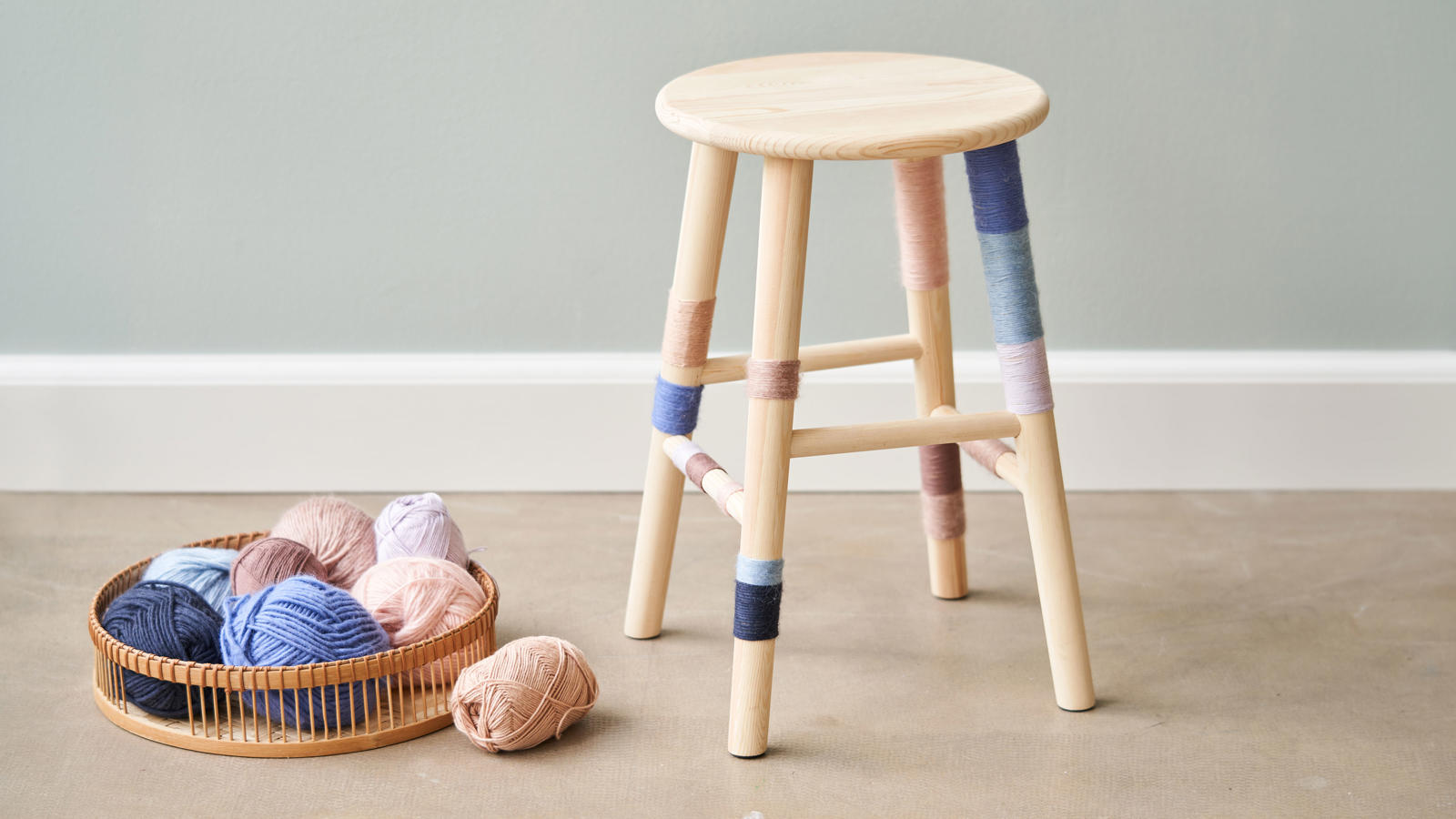 Continue untill you are happy with the look of the chair. You can vary the look by starting and stopping with the yarn in different places on the stool, so the yarn areas are scattered and of various widths. Using different types of yarn gives the stool an exciting look, while using only one type of yarn gives it a more minimalistic look.