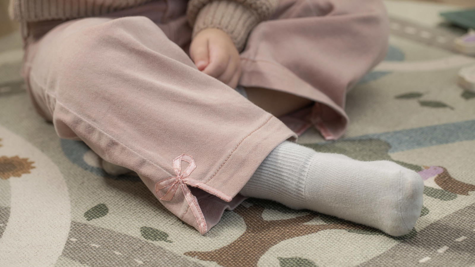 Then attach the bow with pins to the side of the trouser leg opening, ensuring that the bow's ends and loops are evenly distributed on each side of the side seam of the trouser leg.