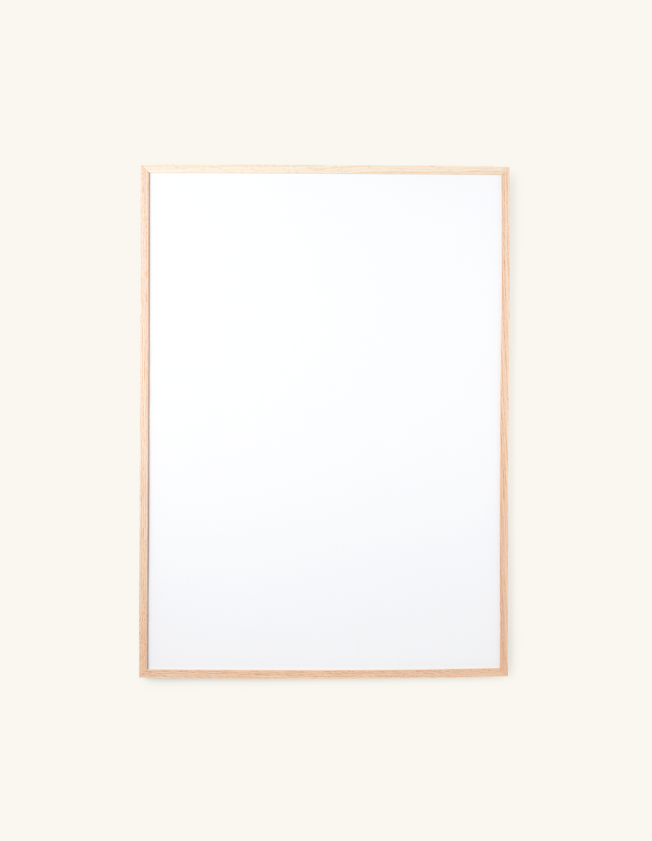 This frame is made of oak wood and plastic. It has an outside dimension of 52 x 71.5 cm and an inside dimension of 50 x 70 cm.