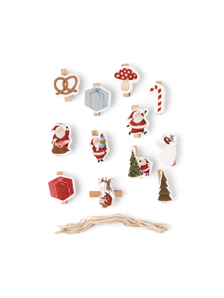 The sisters' Christmas pegs are made of 100% FSC®-certified paper and birch wood. They measure 4 x 0.6 cm and come in different designs. The packet also contains a 2 m string.