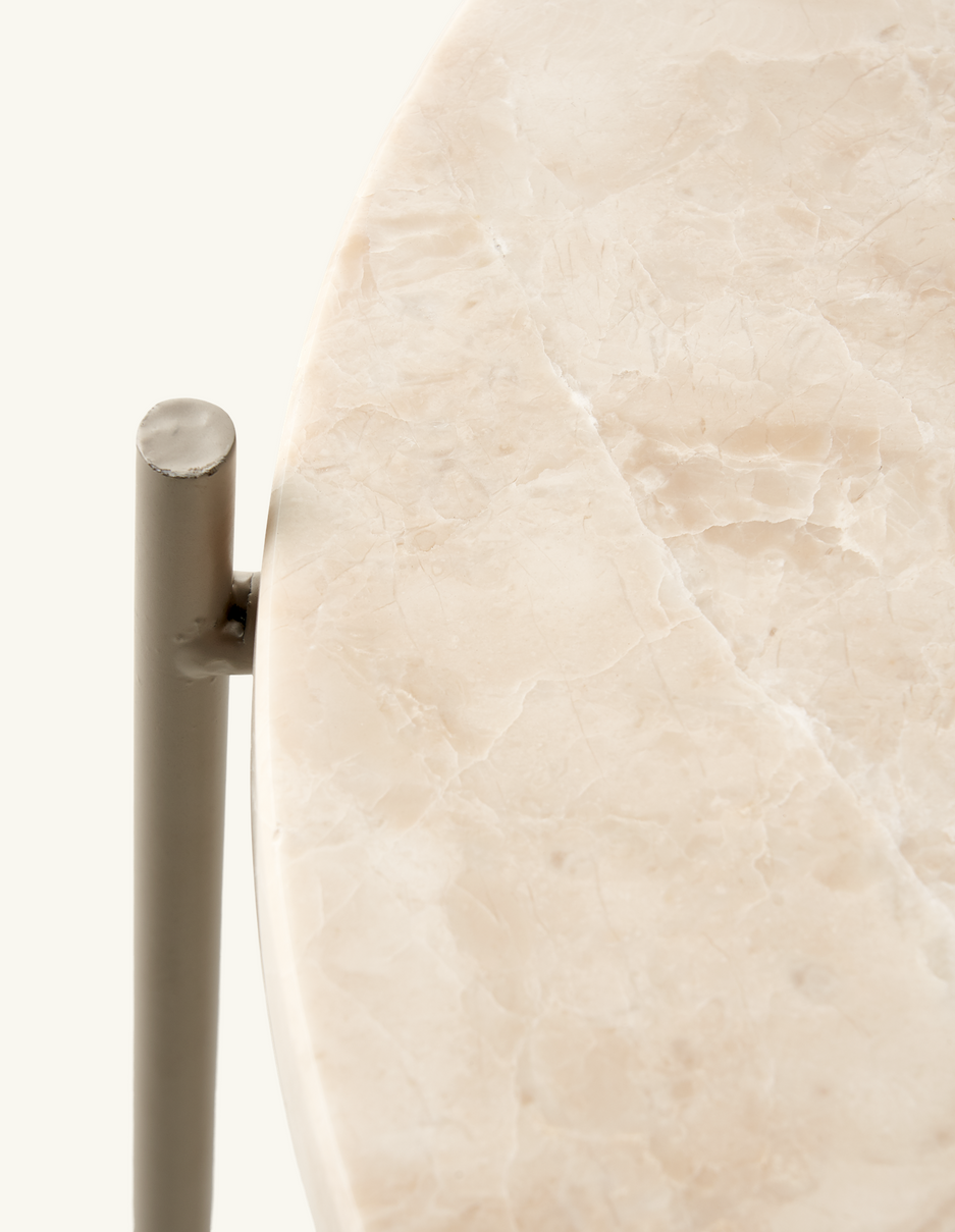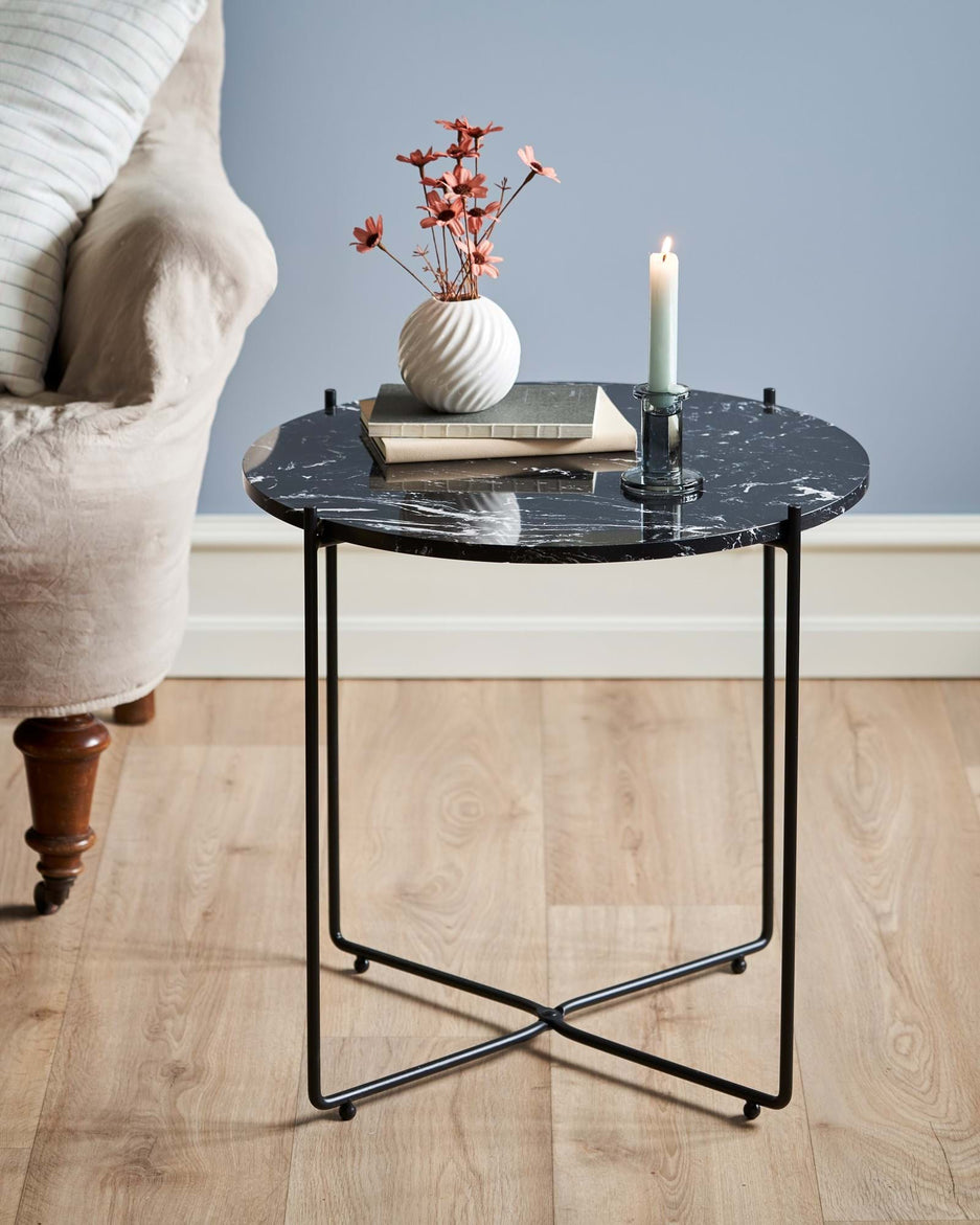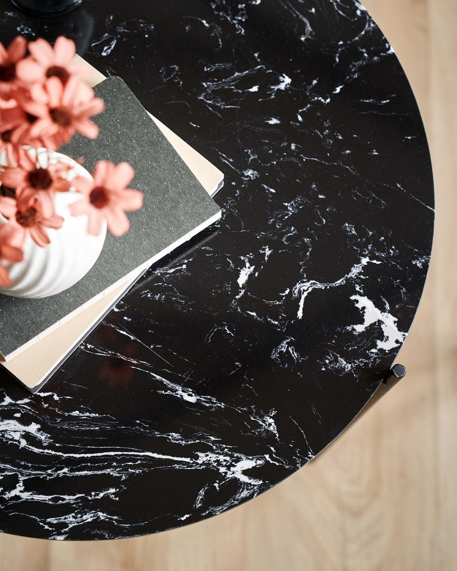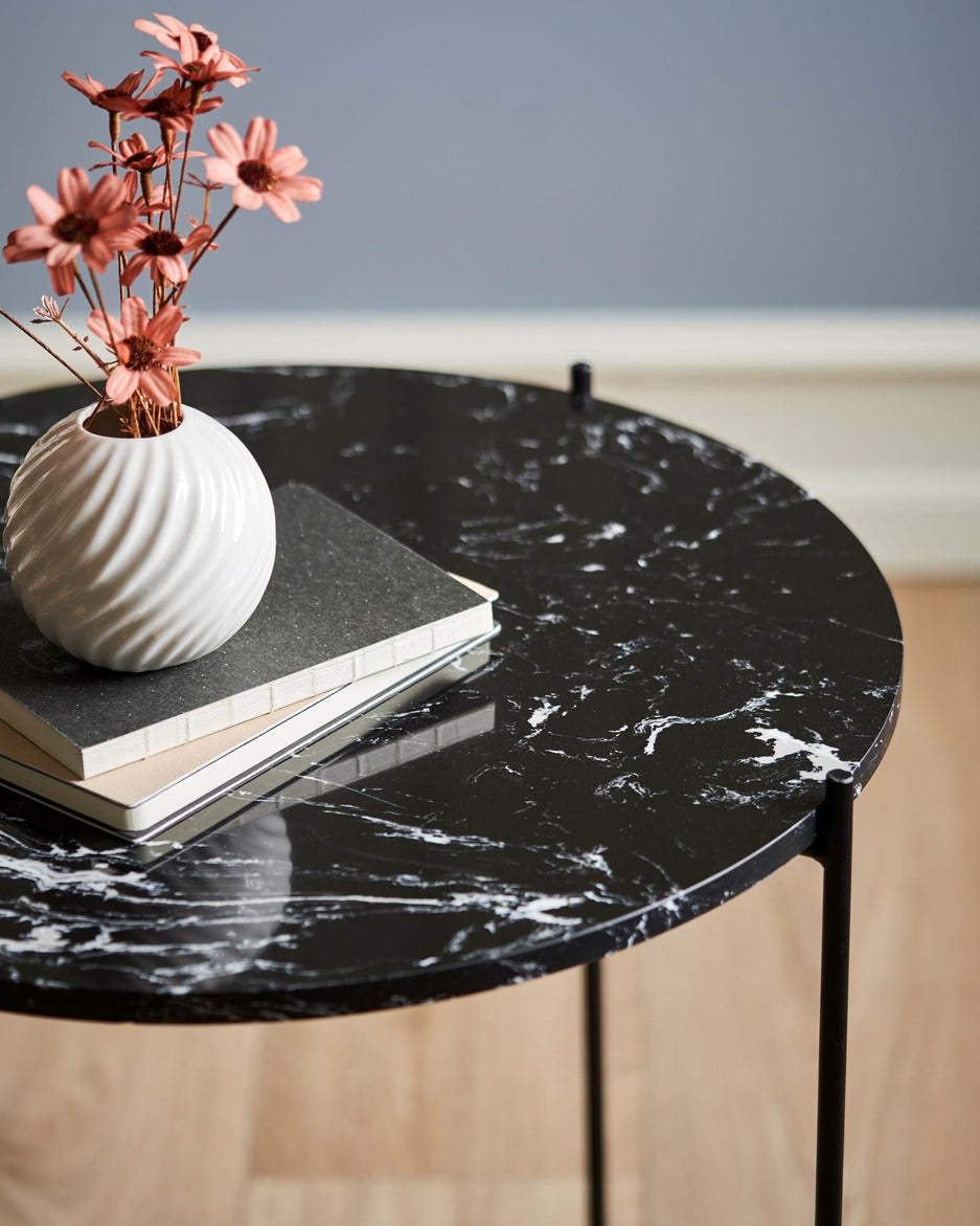 "This side table has a wonderfully elegant look with its lovely marble top," Clara says, and she places a vase with fresh flowers on the table. "A beautiful new addition to any interior."