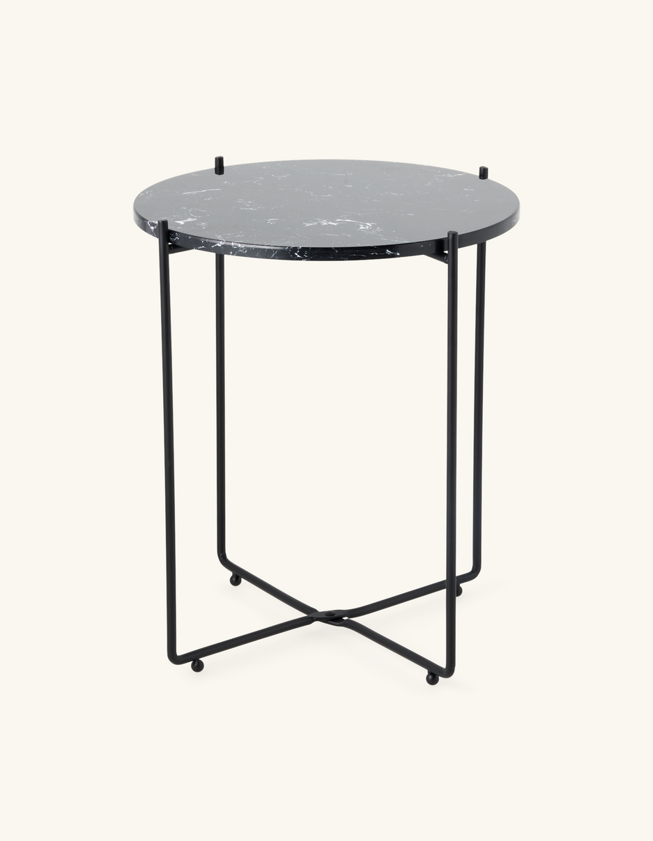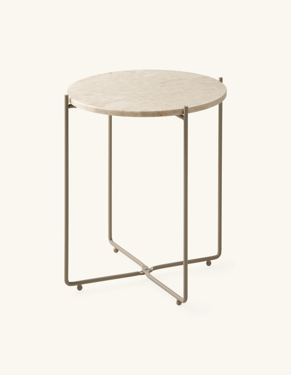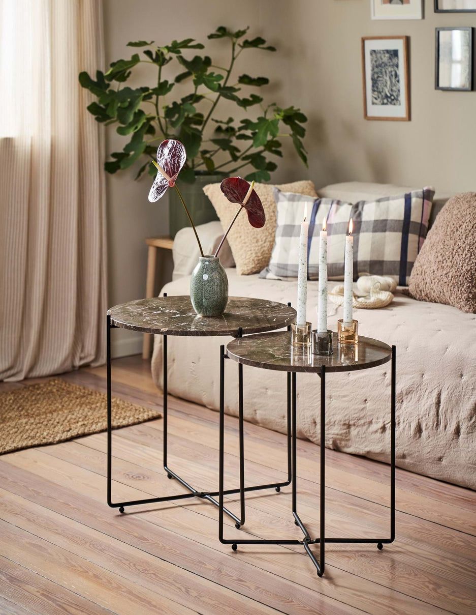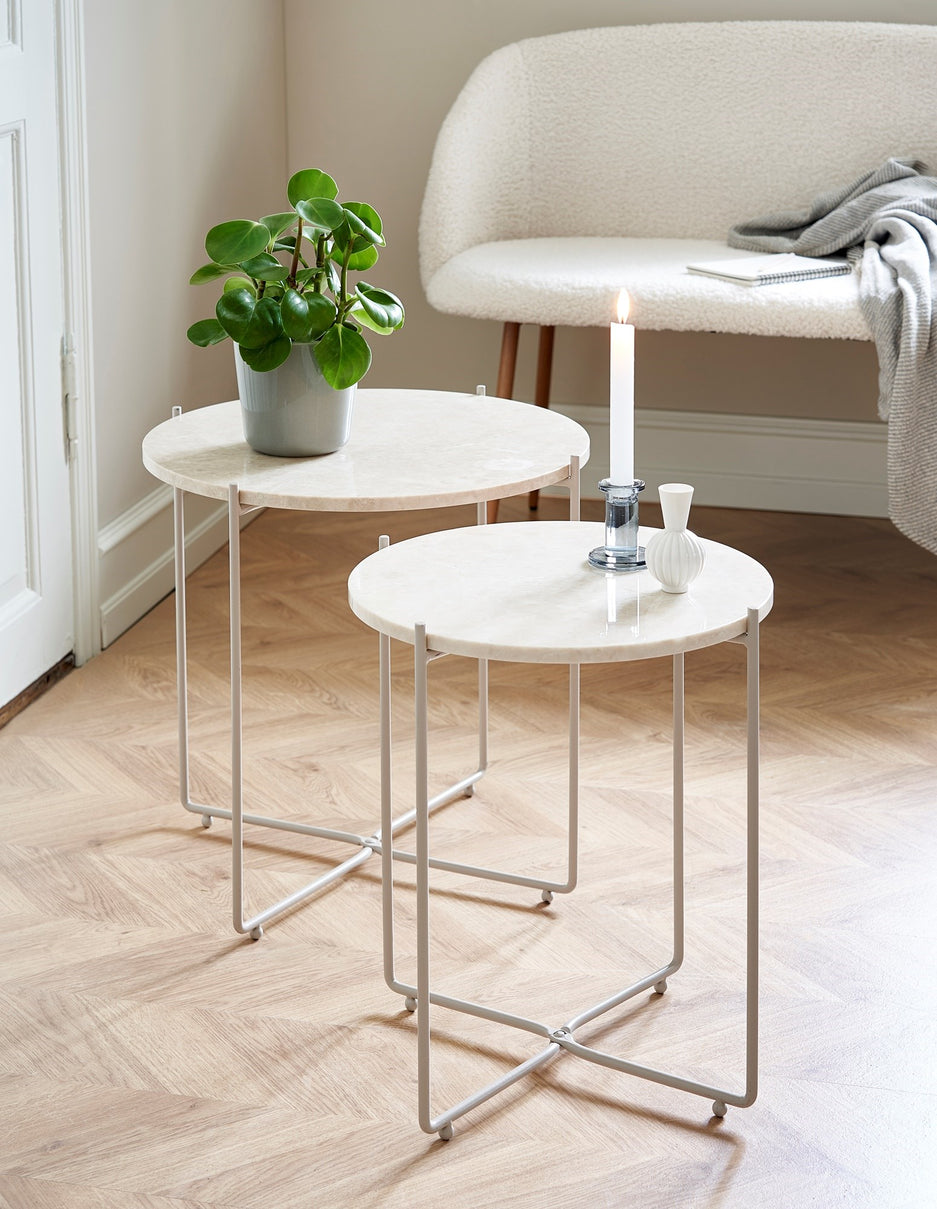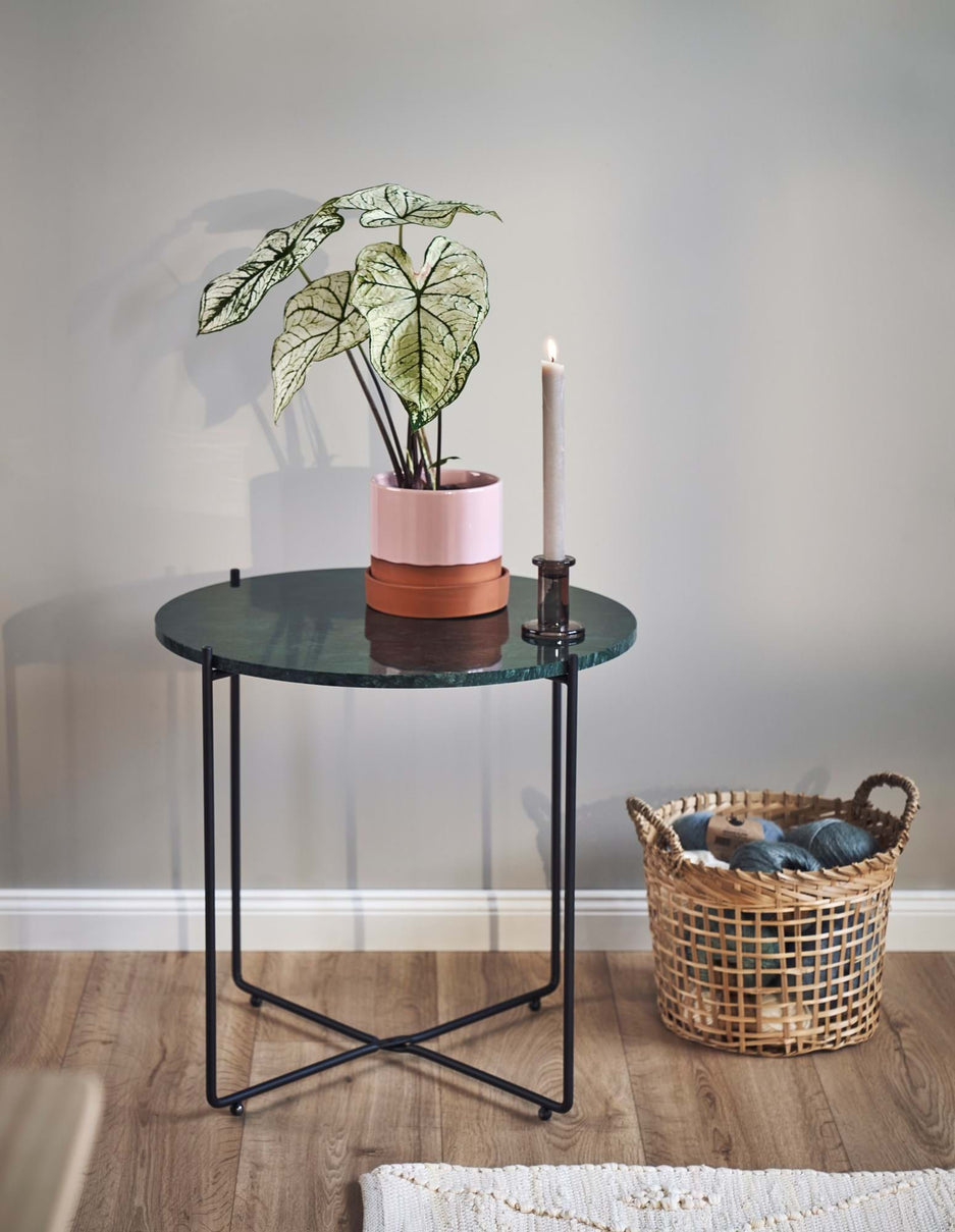 "This side table has a wonderfully elegant look with its lovely marble top," Clara says, and she places a vase with fresh flowers on the table. "A beautiful new addition to any interior."