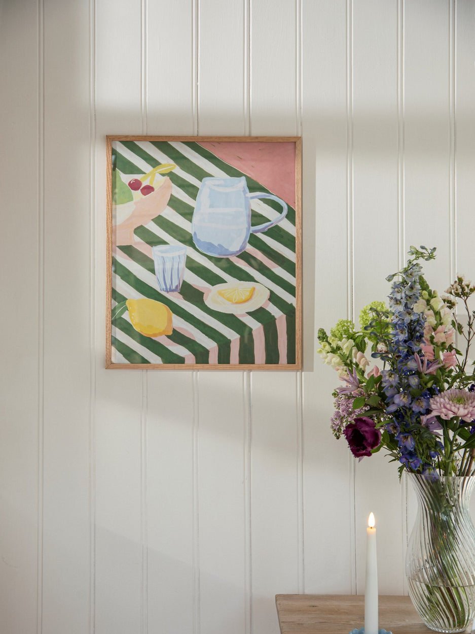 "Art can transform a room, bringing colour and character to any space," Anna says, admiring the poster's hues. "Indeed, and it creates a focal point for conversation," Clara adds thoughtfully.