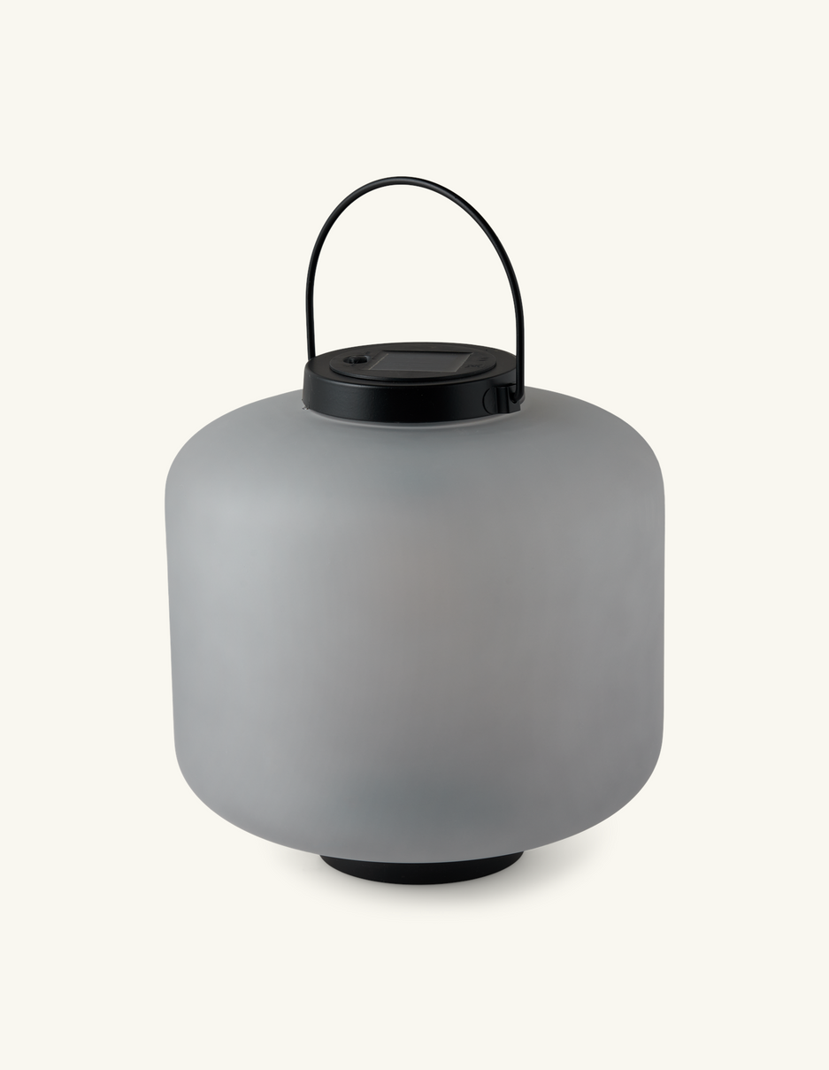 The sisters' solar lamp is made of glass, iron, ABS and polysilicon and measures 21 x 22.5 cm. With the handle, it measures 32 cm in height.